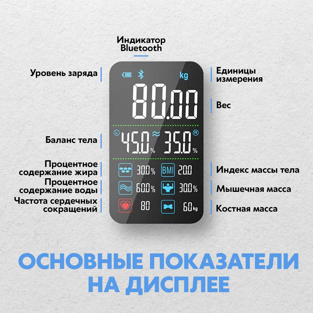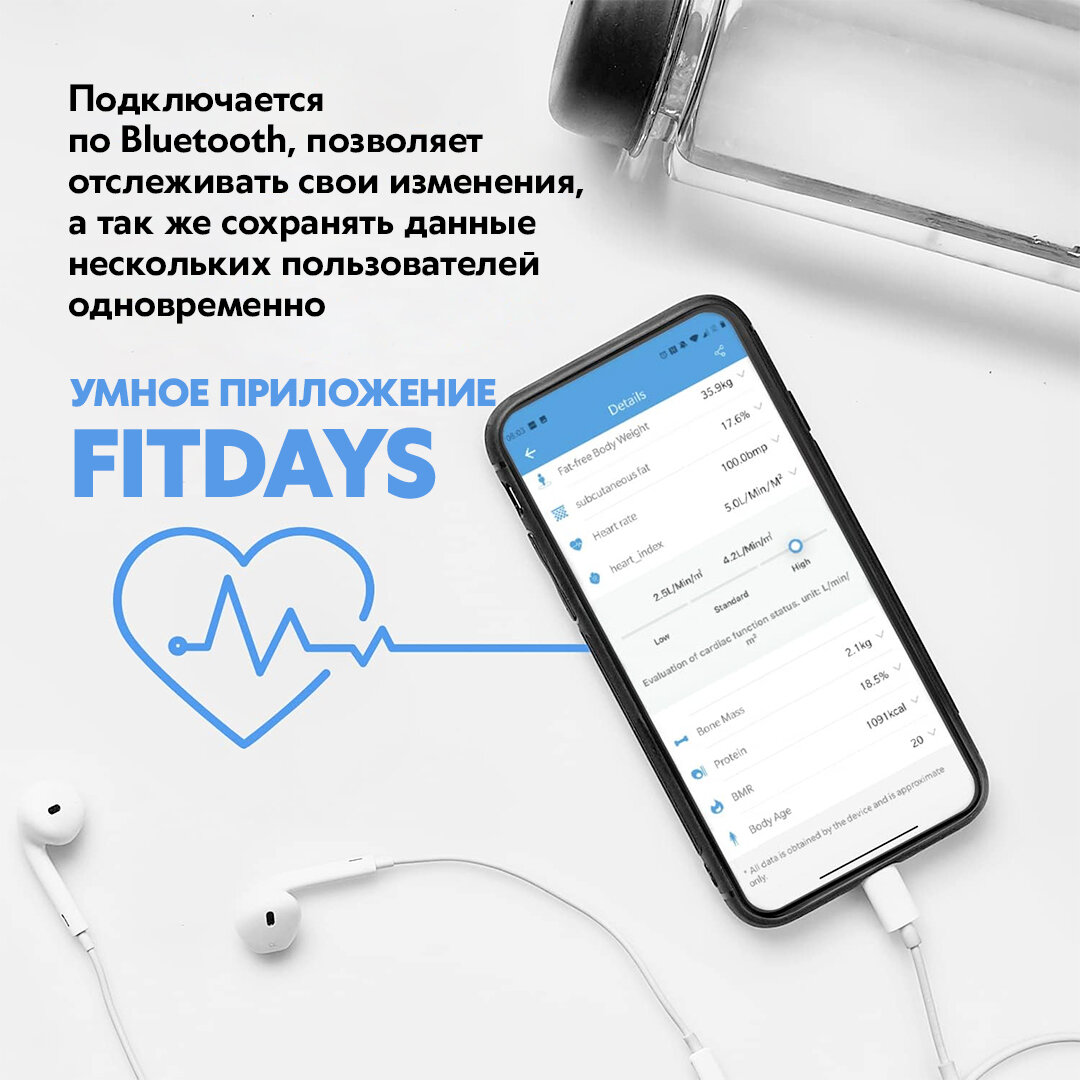 | Дополнительная информация | Измерения параметров тела: Вес, Индекс массы тела, Висцеральный жир, Костная масса, Мышечная масса, Содержание воды, Тип телосложения, Измерение белка, Жировая масса, Базальный метаболизм, Биологический возраст, Метаболизм, Скелетные мышцы |
