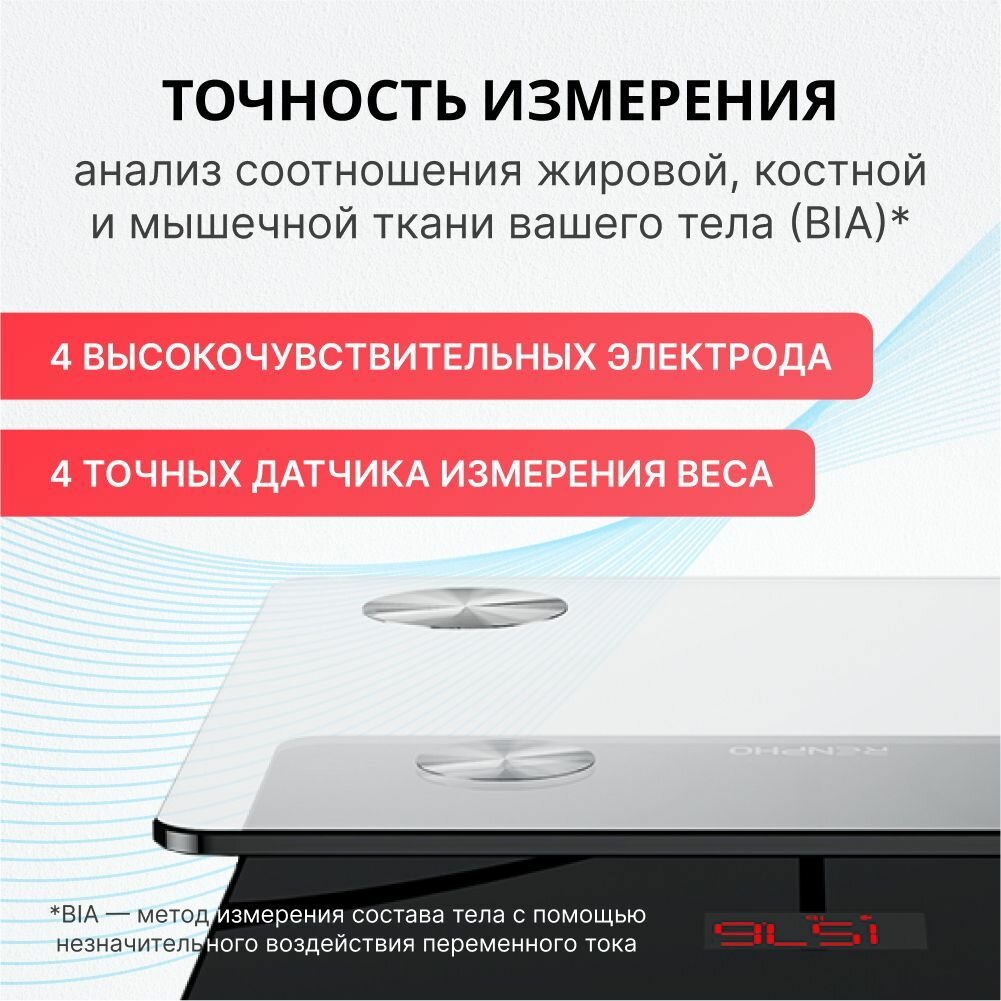 | Дополнительная информация | Прочные нескользящие ножки,высокочувствительные датчики, синхронизация данных через Bluetooth или Wi-Fi с мобильным приложением,анализ состава тела,персонализированные графики изменения параметров тела (в приложении),постановка целей,неограниченное количество пользователей,поддержка синхронизации с фитнес-приложениями (Samsung Health, Fitbit, Google Fit и Apple Health) |