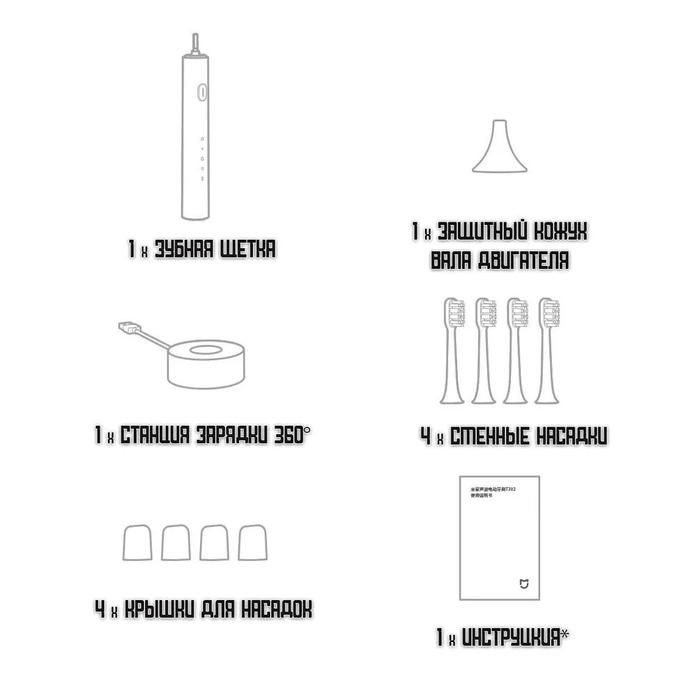 | Подробная комплектация | электрическая зубная щетка, зарядное устройство (подставка), комплект насадок, кабель USB, техническая документация |