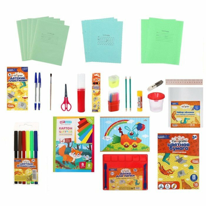 | В комплекте | тетрадь в клетку - 5; тетрадь в косую линейку - 3; тетрадь в линейку - 2; ручка шариковая синяя - 2; набор пластилина - 1; набор цветной бумаги - 1; набор цветного картона - 1; набор цветных карандашей - 1; доска для лепки - 1; карандаш чернографитный - 2; ластик - 1; точилка - 1; ножницы - 1; краски акварельные - 1; кисть - 1; альбом А4 – 1; клей-карандаш - 1; линейка - 1; набор фломастеров - 1; набор обложек - 10; набор счётных палочек - 1 |