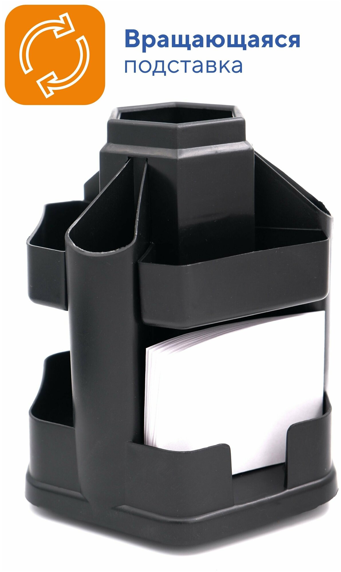 | В комплекте | 2 ручки шариковые, 2 карандаша, 1 ножницы, 1 нож канцелярский, 1 линейка со шкалой 15 см, 1 точилка для карандашей, 1 степлер для скоб 10, 1 набор для скоб 10, 1 набор скрепок, 1 набор декоративных силиконовых кнопок, 1 канцелярская лента 12мм*5м в диспенсере, 1 антистеплер, 1 блок для записи с липким слоем 76*76 желтый, 1 ластик и сама пластиковая подставка на поворотной платформе |