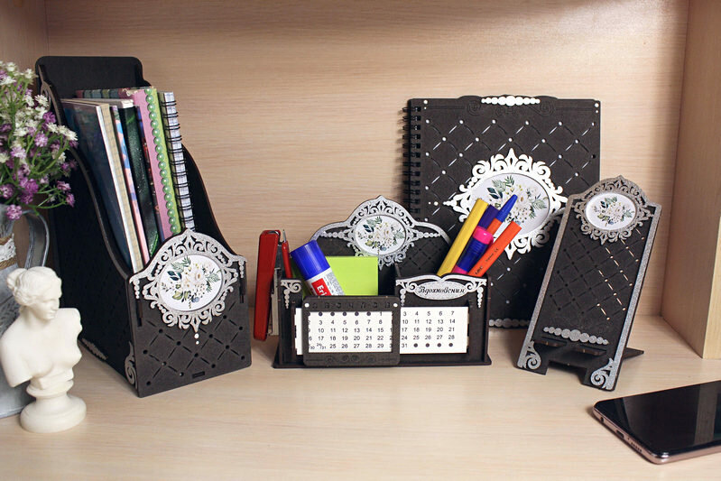 Подарочный канцелярский набор Учителю, коллеге, подруге, школьнику. Деревянный блокнот, органайзер, лоток для бумаг, подставка для телефона. МДФ. ТМ "Канышевы"