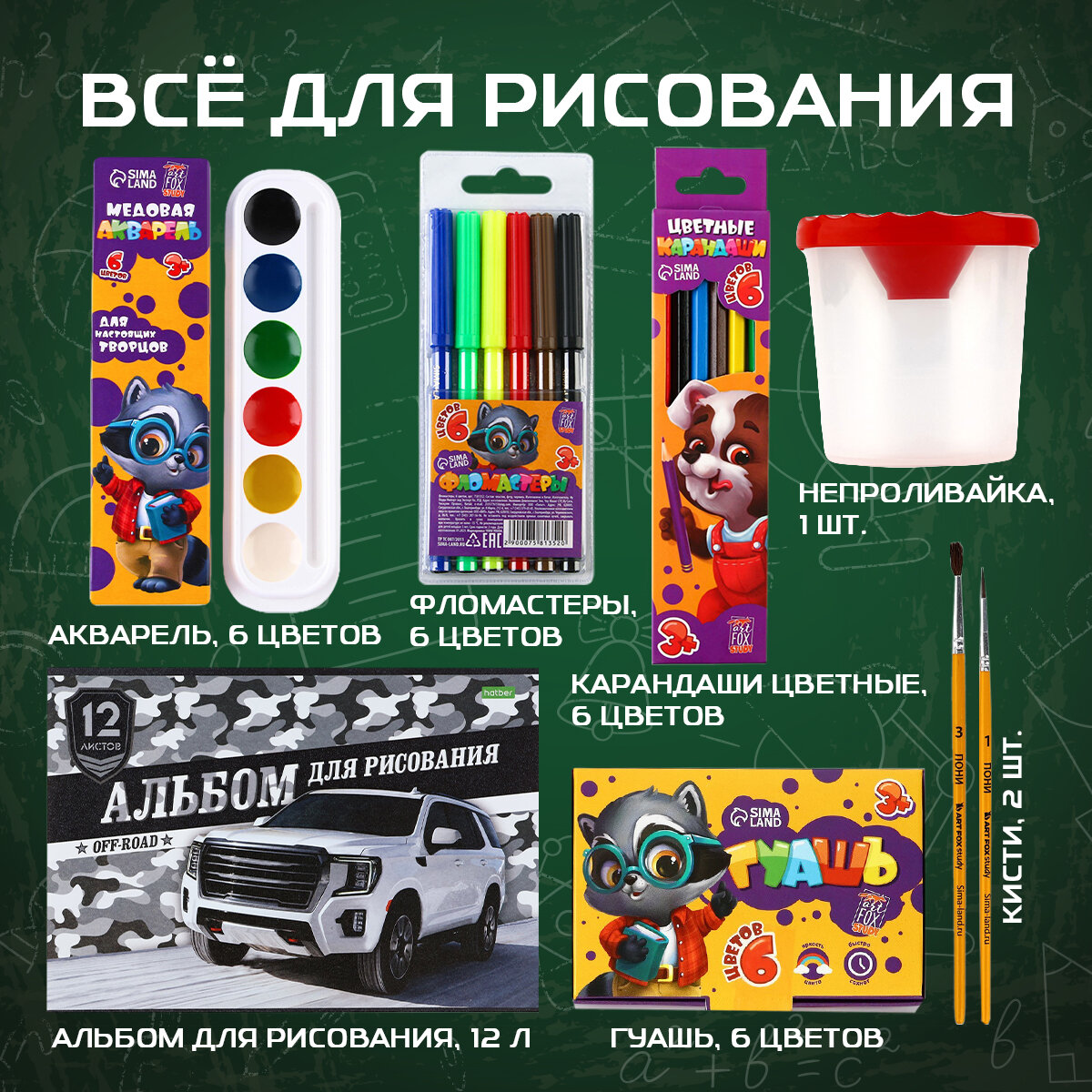 | В комплекте | Набор содержит 54 предмета : Тетрадь, А5,12 листов, клетка - 5 шт.; Тетрадь, А5,12 листов, линия -5 шт.; Тетрадь, А5,12 листов, косая линия - 2 шт.; Цветной картон, А4, 6 листов - 1 шт.; Белый картон, А4, 6 листов - 1 шт.; Обложка для тетрадей - 10 шт.; Бумага цветная, 8 листов, 8 цветов - 1 шт.; Альбом А4, 12 листов - 1 шт.; Акварель медовая, 6 цветов - 1 шт.; Гуашь 6 цветов - 1 шт.; Кисточка, пони №1, №3 - 2 шт.; Ножницы - 1 шт.; Точилка - 1 шт.; Ластик - 1 шт.; Ручки - 3 шт.; Карандаши - 2 шт.; Цветные карандаши, 6 цветов - 1 шт.; Фломастеры 6 цветов - 1 шт.; Линейка, дерево, 15 см - 1 шт.; Стакан-непроливайка, 210 мл - 1 шт.; Пенал пластиковый - 1 шт.; Расписание уроков, А4 - 1 шт.; Доска для лепки, А5 - 1 шт.; Пластилин, 6 цветов - 1 шт.; Набор стеков для лепки - 3 шт.; Картонные закладки - 5 шт.; Счётные палочки, 30 штук -1 шт. |