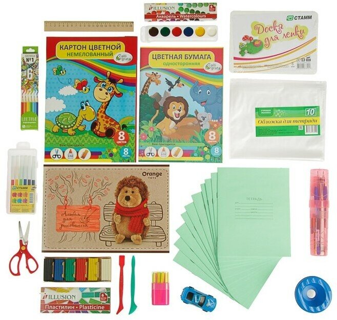 | В комплекте | Набор содержит 40 предметов:тетрадь в клетку - 5;тетрадь в косую линейку - 3;тетрадь в линейку - 2;ручка шариковая синяя - 2;набор пластилина - 1;набор цветной бумаги - 1;набор цветного картона - 1;набор цветных карандашей - 1;доска для лепки - 1;карандаш чернографитный - 2;ластик - 1;точилка - 1;ножницы - 1;краски акварельные - 1;кисть - 1;альбом А4 - 1;клей-карандаш - 1;линейка - 1;набор фломастеров - 1;набор обложек 10 шт - 1;набор счётных палочек - 1; |
