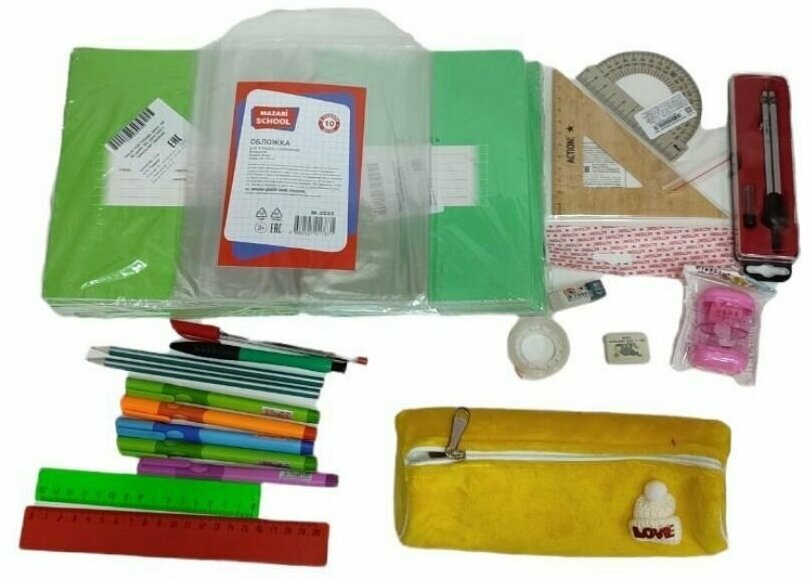 | В комплекте | Простой карандаш – 2 шт/ Ручка шариковая синяя – 2 шт/ Ручка шариковая зеленая - 1 шт/ Ручка шариковая красная 1 шт/ Счетные палочки/ Закладки для книг – 5 шт/ Подставка для книг/ Папка для тетрадей/ Точилка/ Ластик – 2 шт/ Линейка 15 см/ Линейка 20 см/ Тетради в клетку – 5 шт/ Тетради в косую линию – 5 шт/ Обложки для тетрадей – 5 шт/ Пенал/ Цветные карандаши 12 цветов/ Акварель 12 цветов/ Кисточка №3/ Кисточка №6/ Стакан непроливайка/ Палитра/ Клей ПВА/ Кисточка для клея/ Клей карандаш/ Ножницы/ Пластилин 8 цветов/ Доска для пластилина/ Фартук + нарукавники/ Цветная бумага/ Цветной картон/Белый картон/Альбом для рисования/ Фломастеры 12 цветов/ Пенал для кисточек/ Папка с ручками для уроков рисования/ Клеенка для творчества/ Папка на замке для уроков по технологии/ Гуашь 12 цв. |