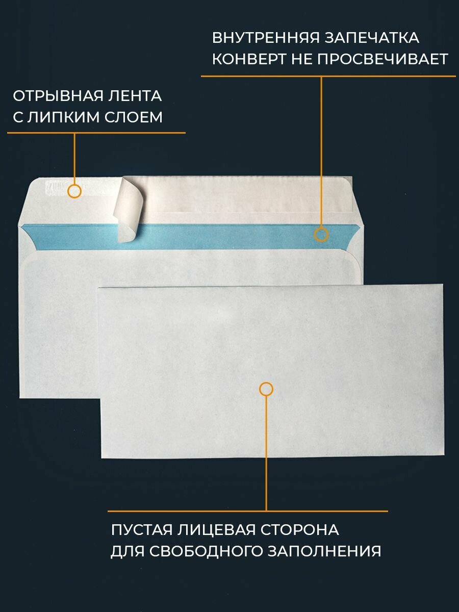 Почтовые конверты бумажные Е65 (110х220мм) 200 шт. отрывная лента, запечатка, белые для документов E65