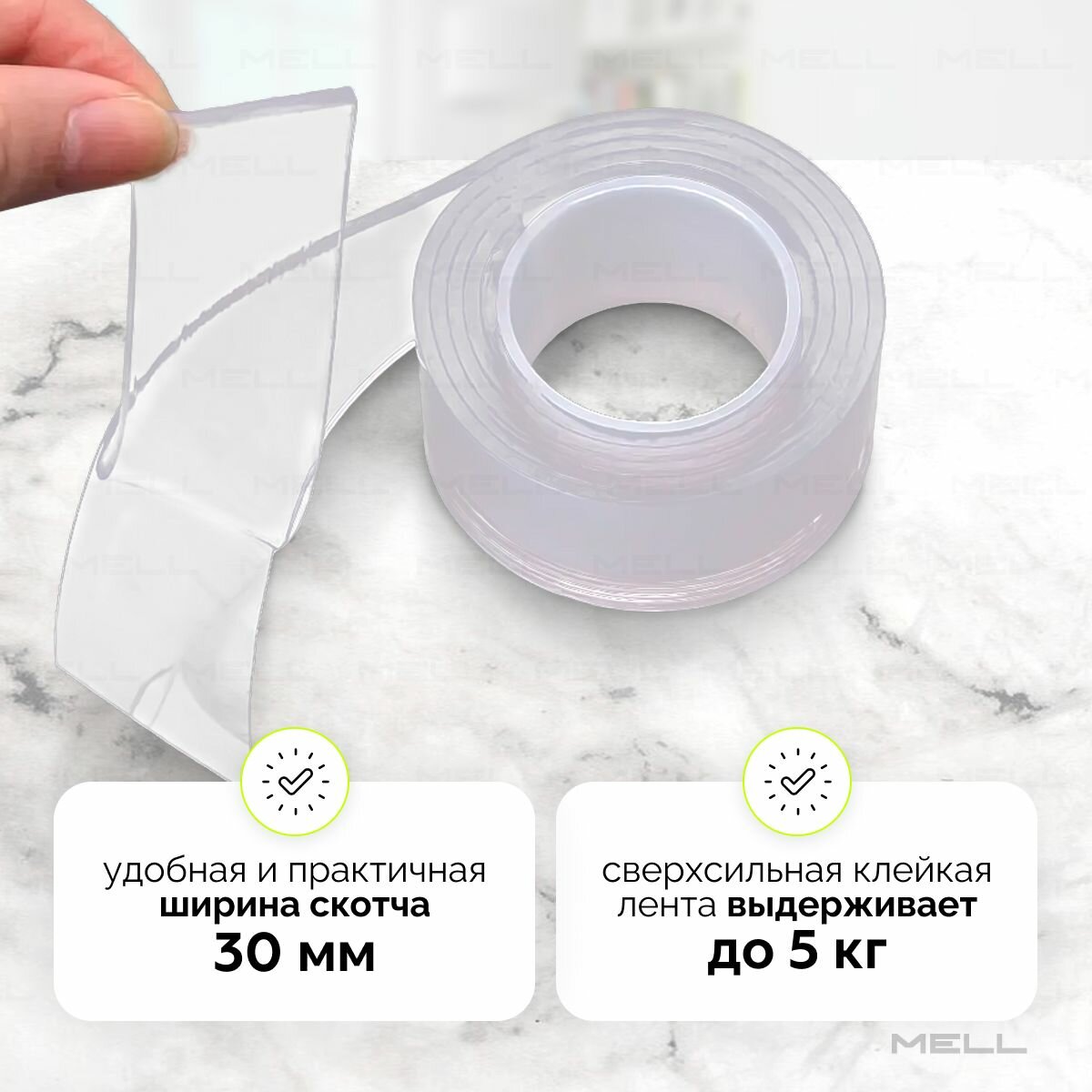 Купить Нано скотч двухсторонний MELL прозрачный многоразовый 3 м, 30 мм / тонкая клейкая лента для фиксации на различных поверхностях / самоклеящаяся гибкая полоска