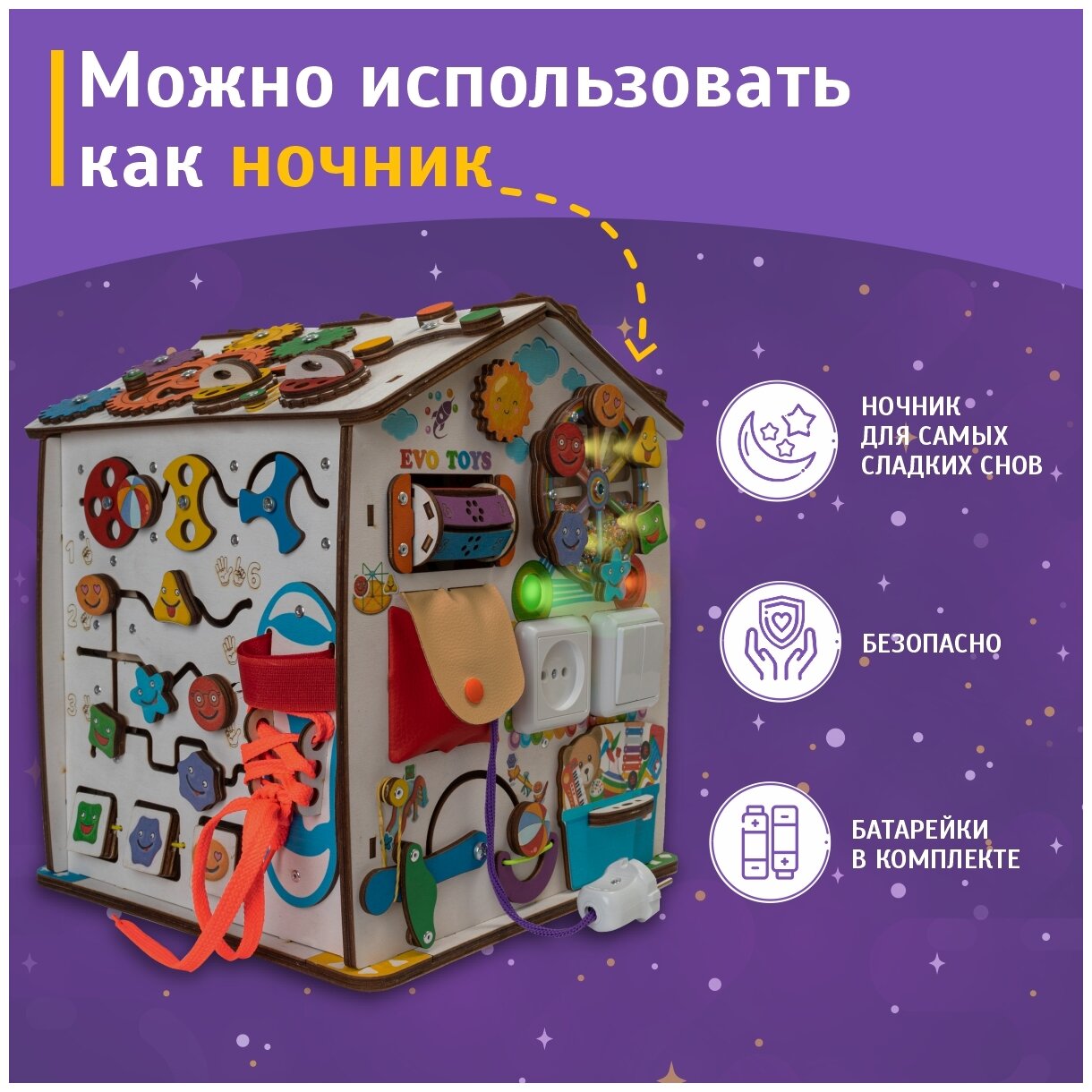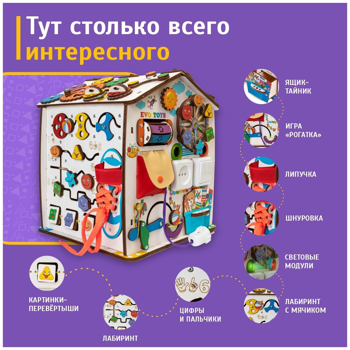 Купить Бизиборд развивающий домик Evotoys Смайлики на аттракционе 30х35 см со светом