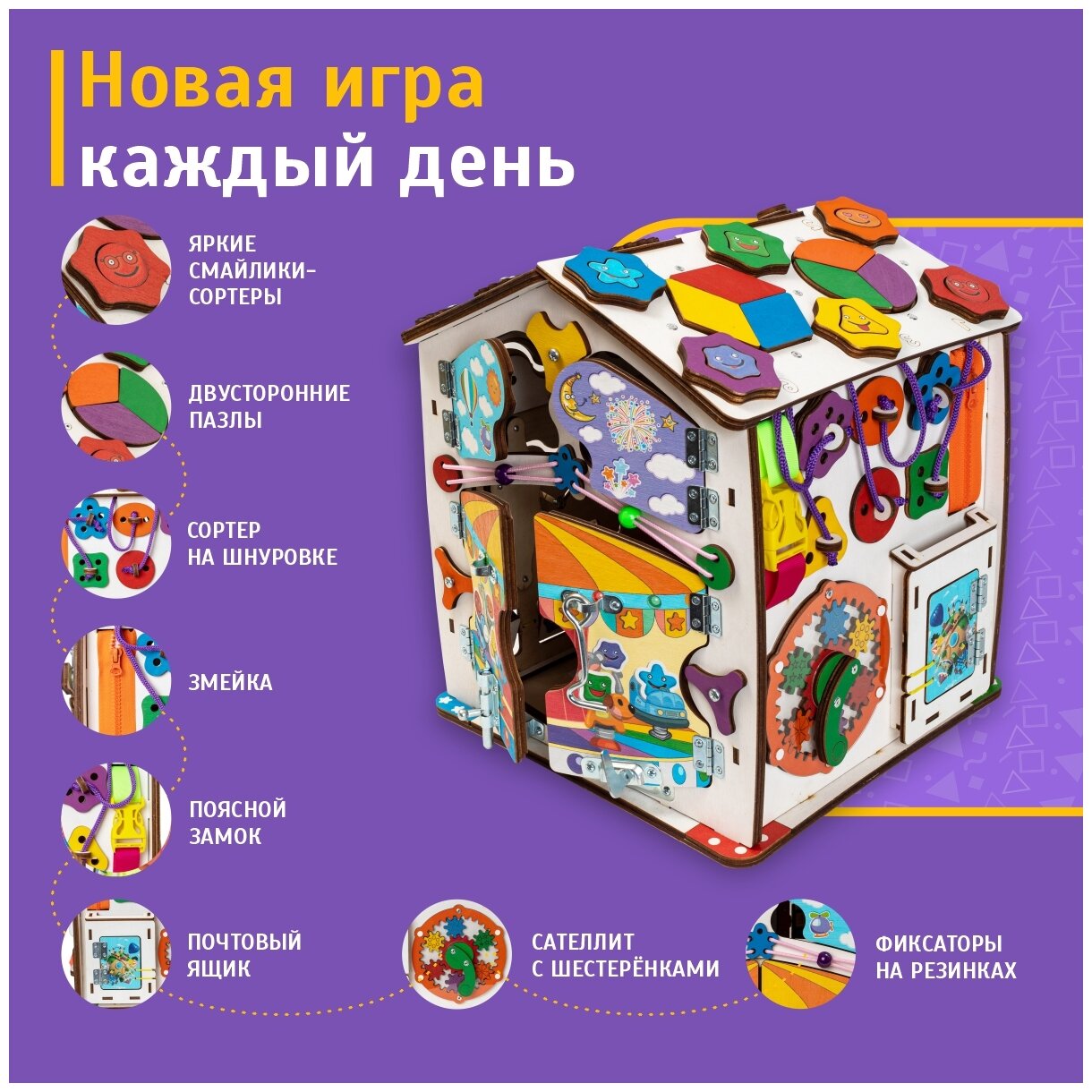 | Комплектация | Комплектация товара: 1 сторона домика - переключатель, с помощью которого включаем свет на колесе обозрения, вилка с розеткой, крутилка-солнышко (1 деталь), барабан (учим цифры и цвет), игра "Рогатка", кармашек с пуговкой, ящик тайник; 2 сторона домика - спинеры (1 большой и 2 маленьких), 4 яркие дверки в тематике цирка, замочки (крючок, щеколда, форточный замочек), бусинки на веревочке (2 детали); 3 сторона домика - 3 картинки-перевертыши, лабиринт-водилка с разными шайбами (6 деталей), лабиринт с препятствием, липучка, шнуровка; 4 сторона домика - цветной сортер на шнуровка (6 деталей разной формы и цвета), почтовый ящик, поясной замочек, змейка, саттелит с ручкой; 1 сторона крыши - цветные пазлы (6 деталей разного цвета), фигурки-смайлики (6 деталей разной формы и цвета), ободки для смайликов (6 деталей); 2 сторона крыши - 1 трещотка, 1 большая шестеренка и 4 маленьких, спинер (1 деталь). |