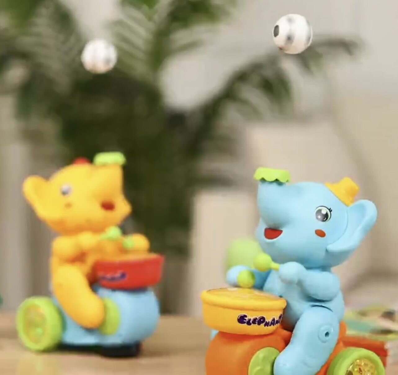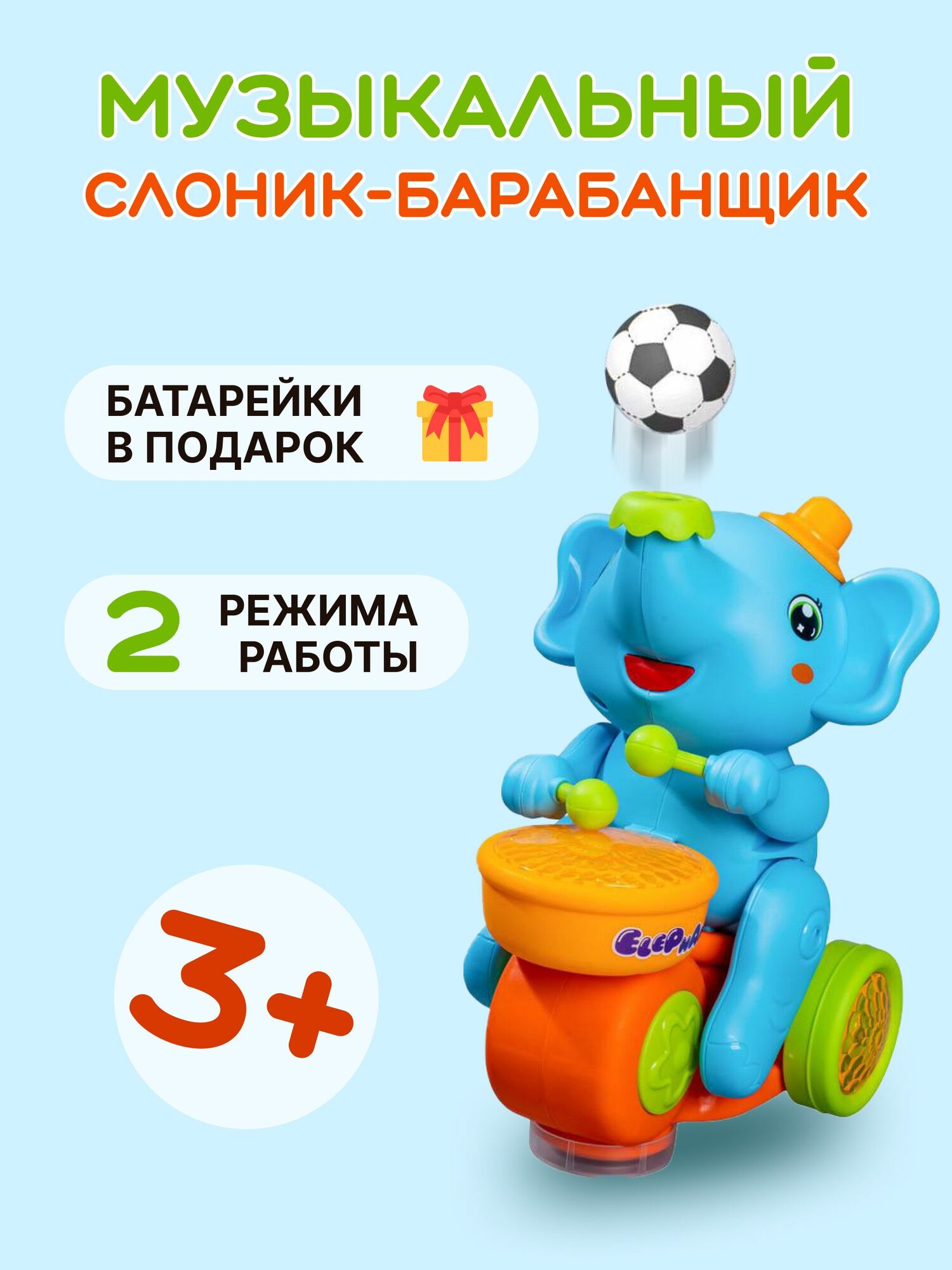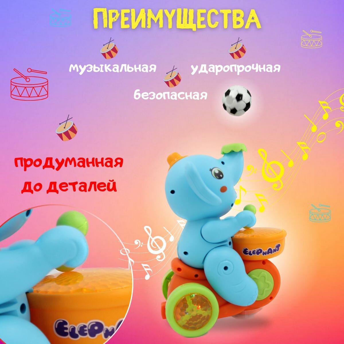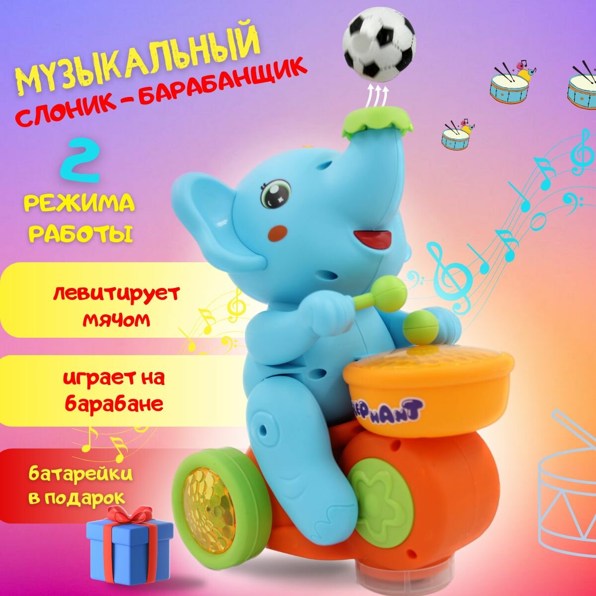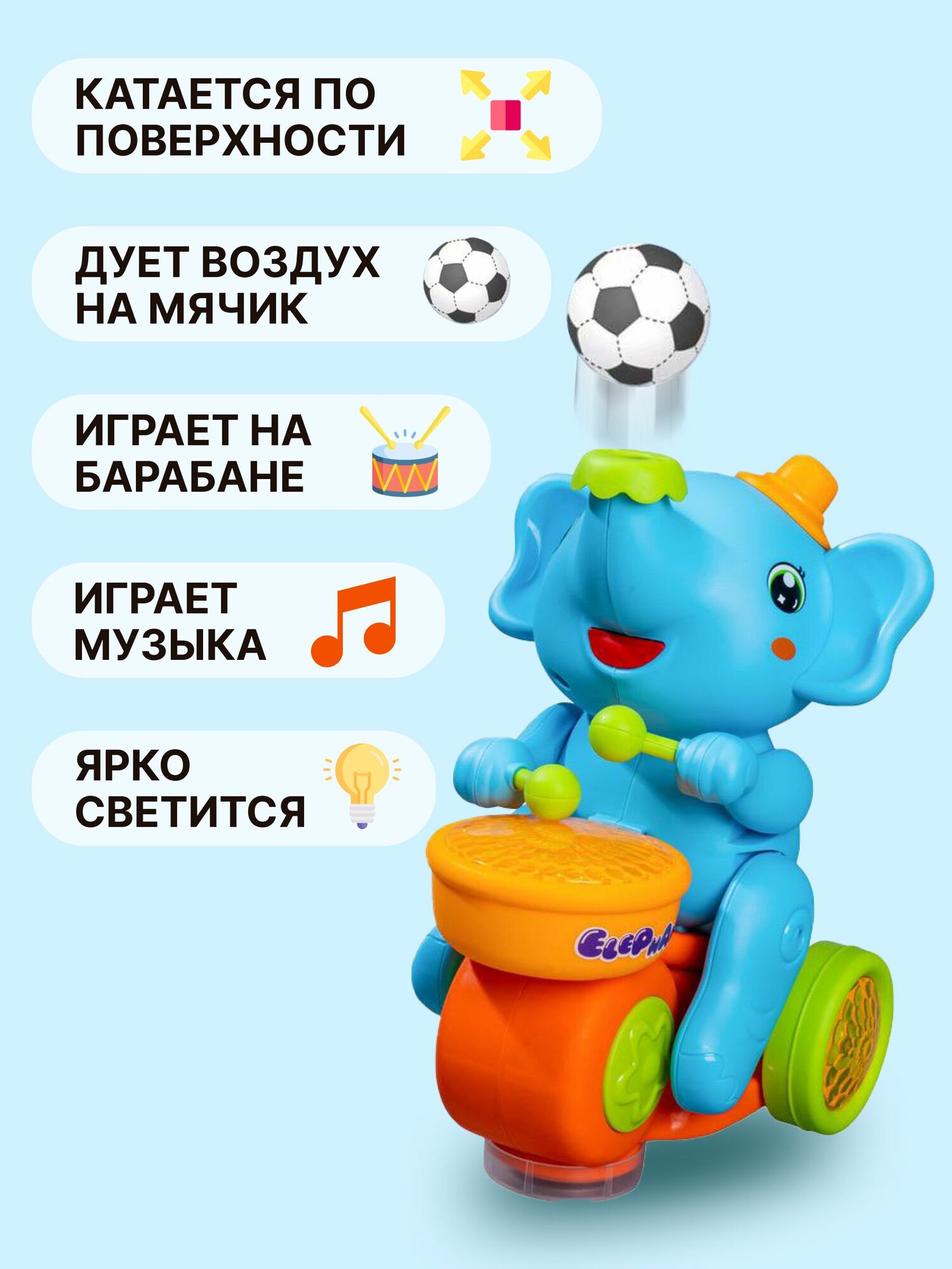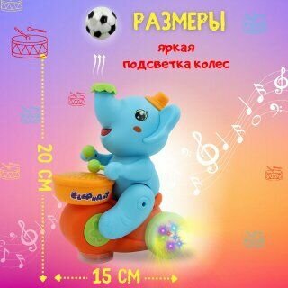 Музыкальная игрушка Веселый Слоненок с барабаном, едет, хоботом выдувает мяч, звуковые и световые эффекты интересное: