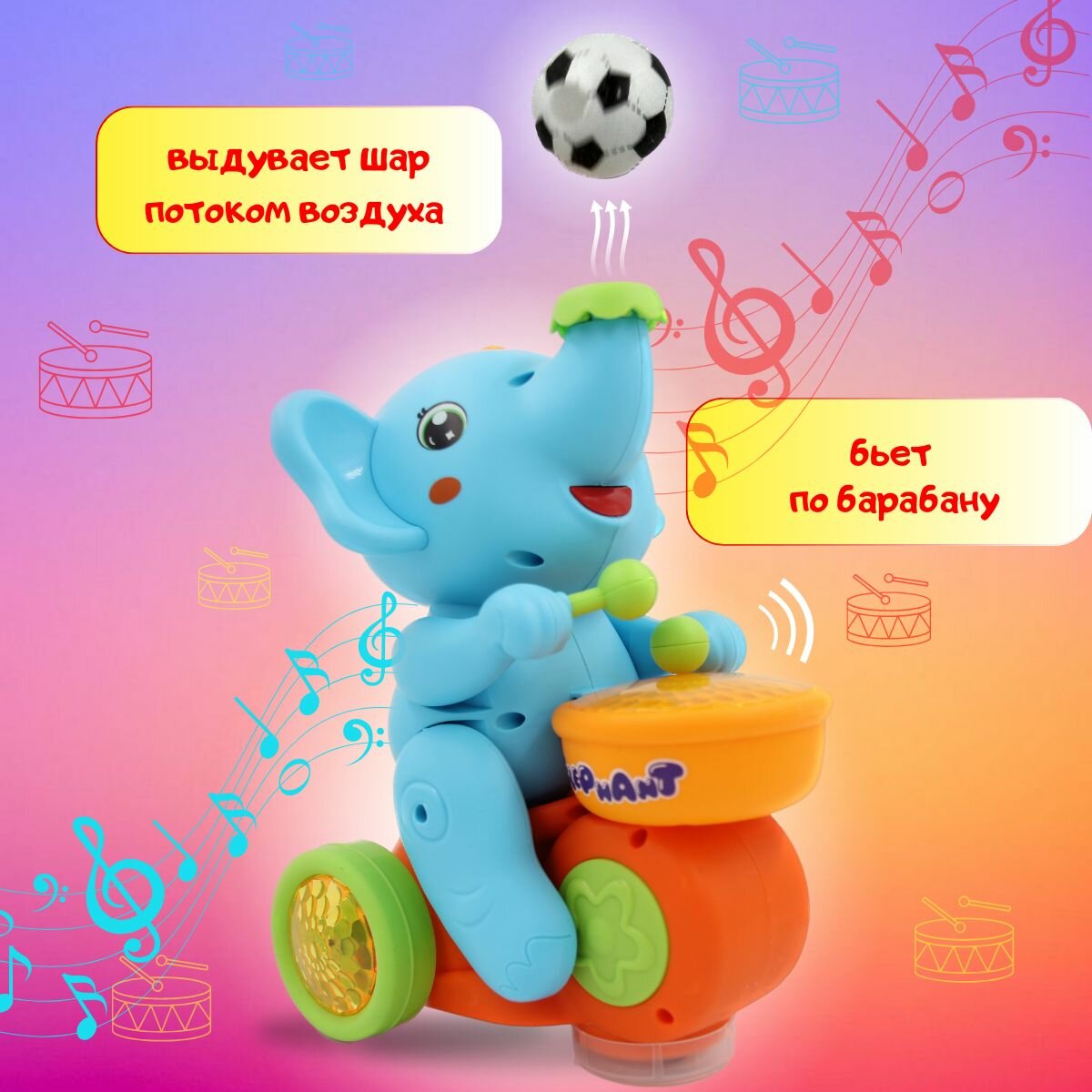 Купить Музыкальная игрушка Веселый Слоненок с барабаном, едет, хоботом выдувает мяч, звуковые и световые эффекты