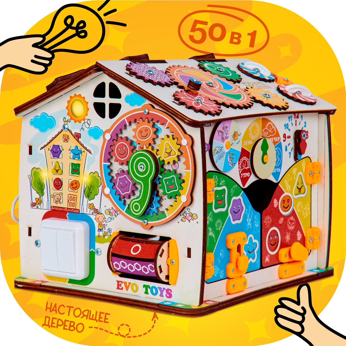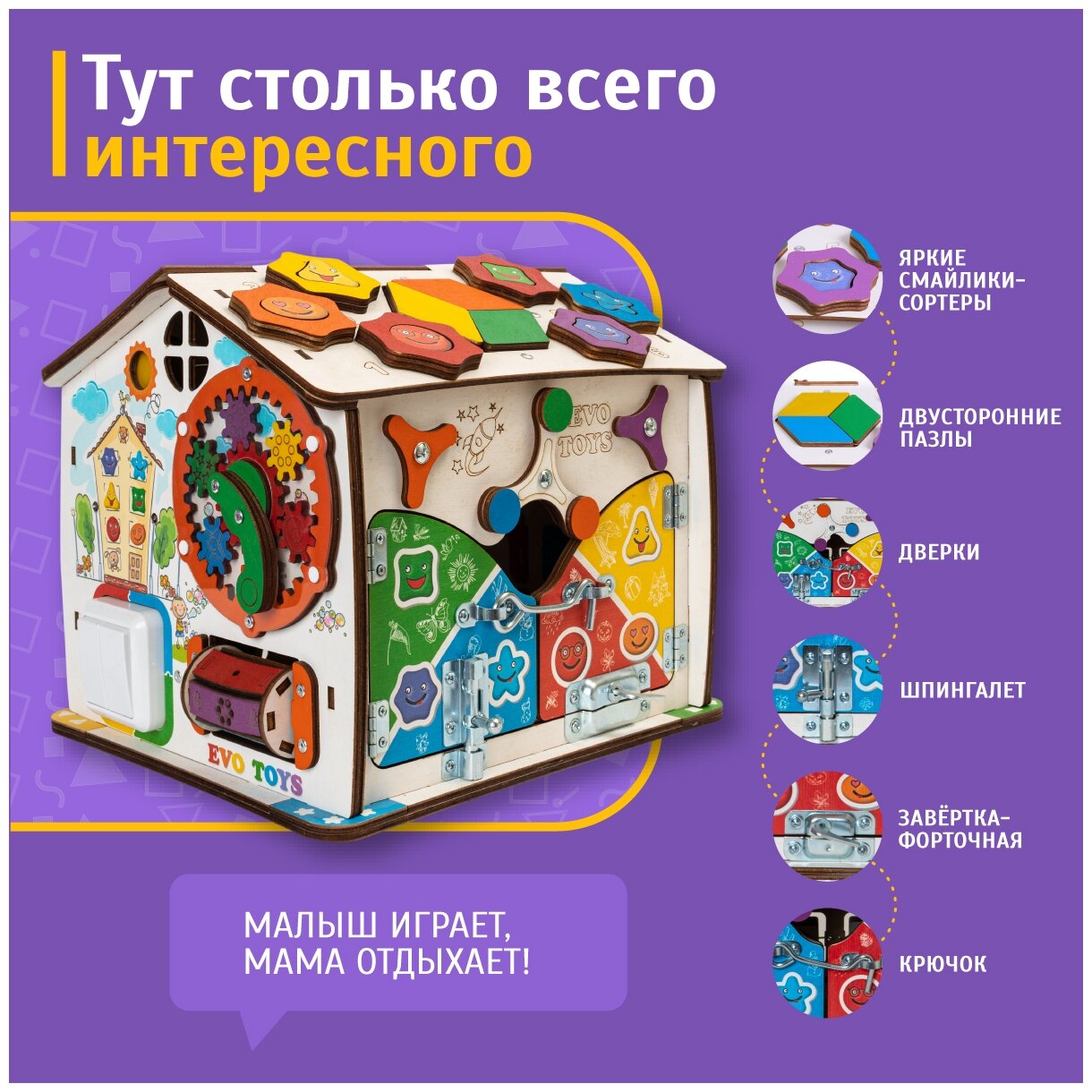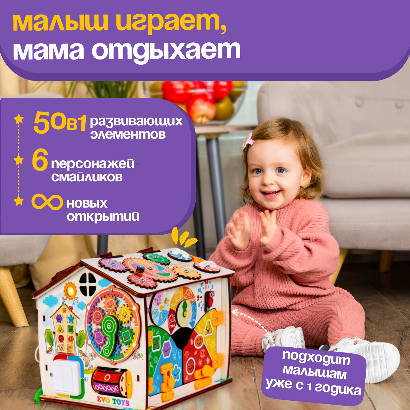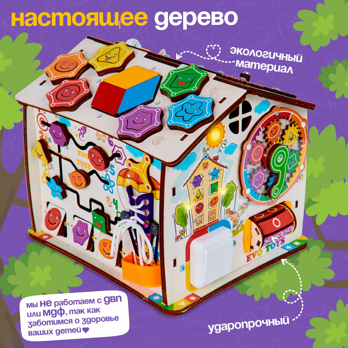 Купить Бизиборд домик развивающий Evotoys Бизидомик в котором живут Смайлики 25х25х29 со светом