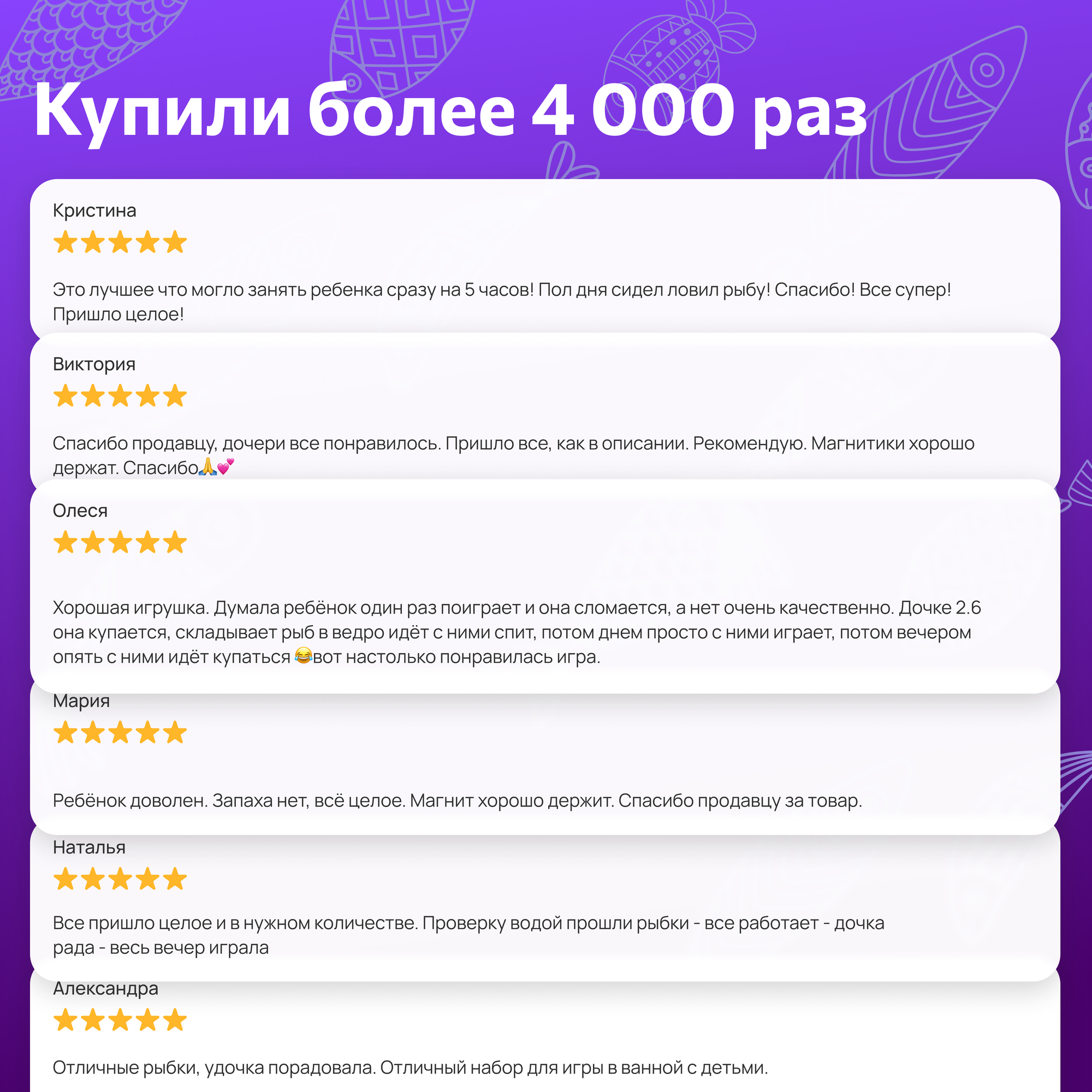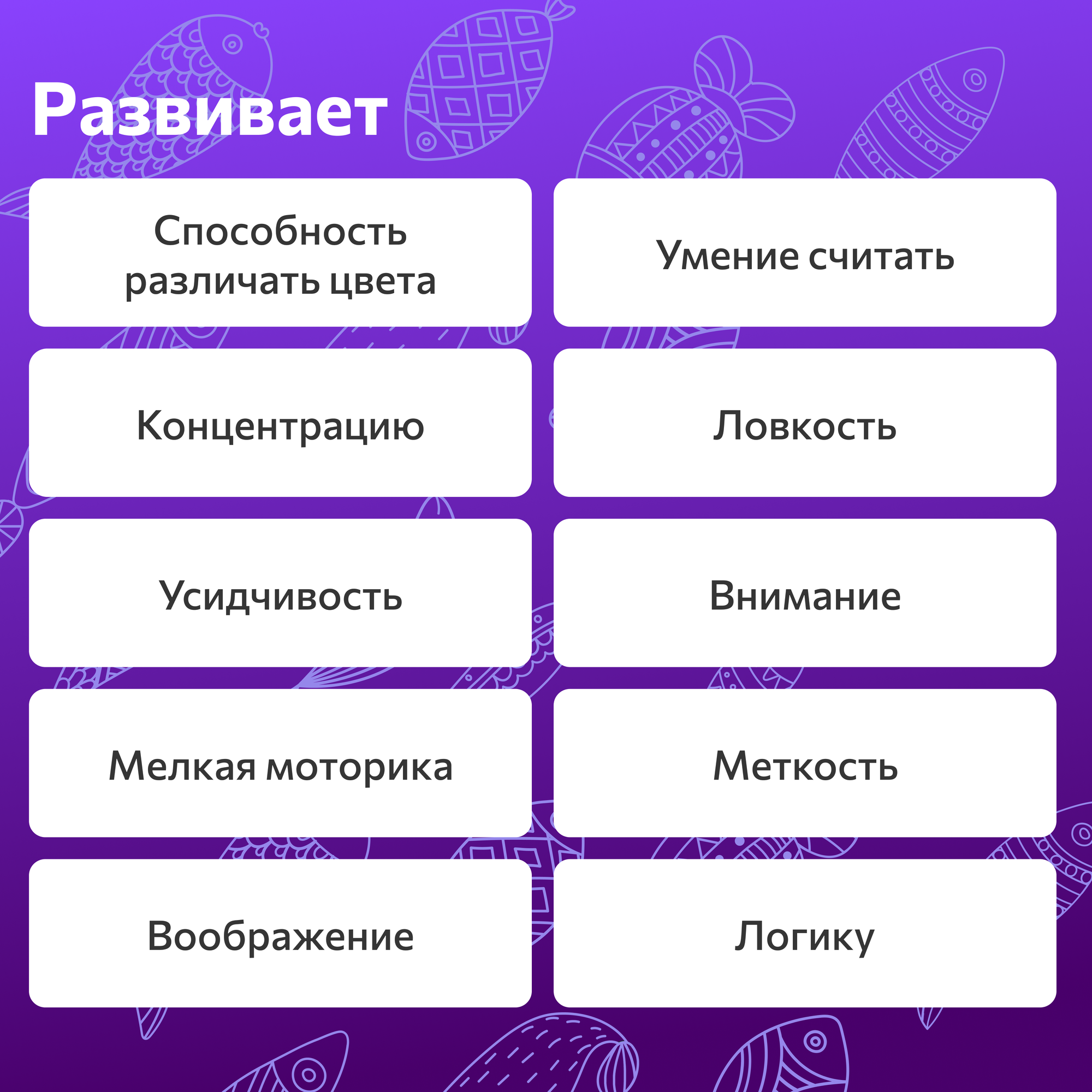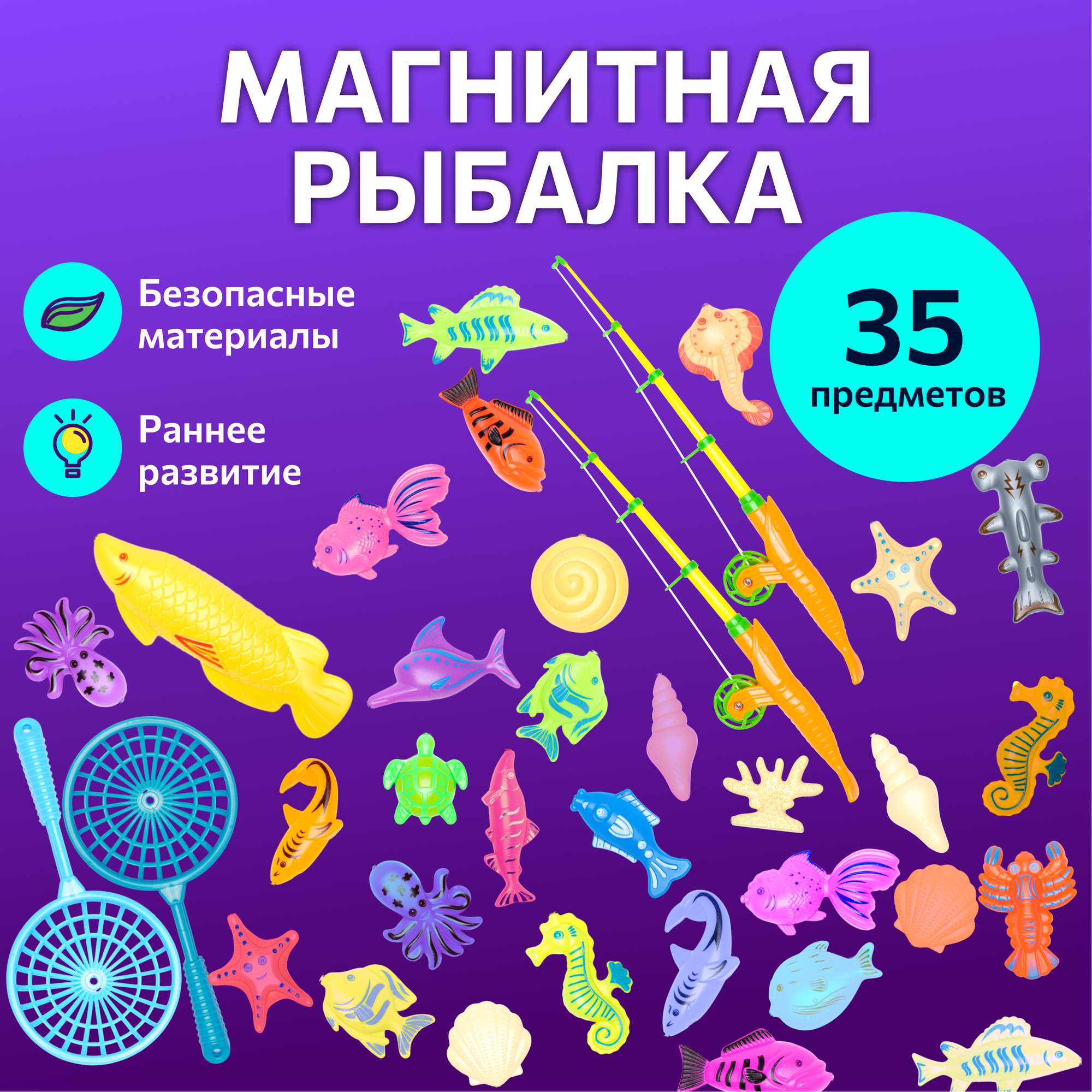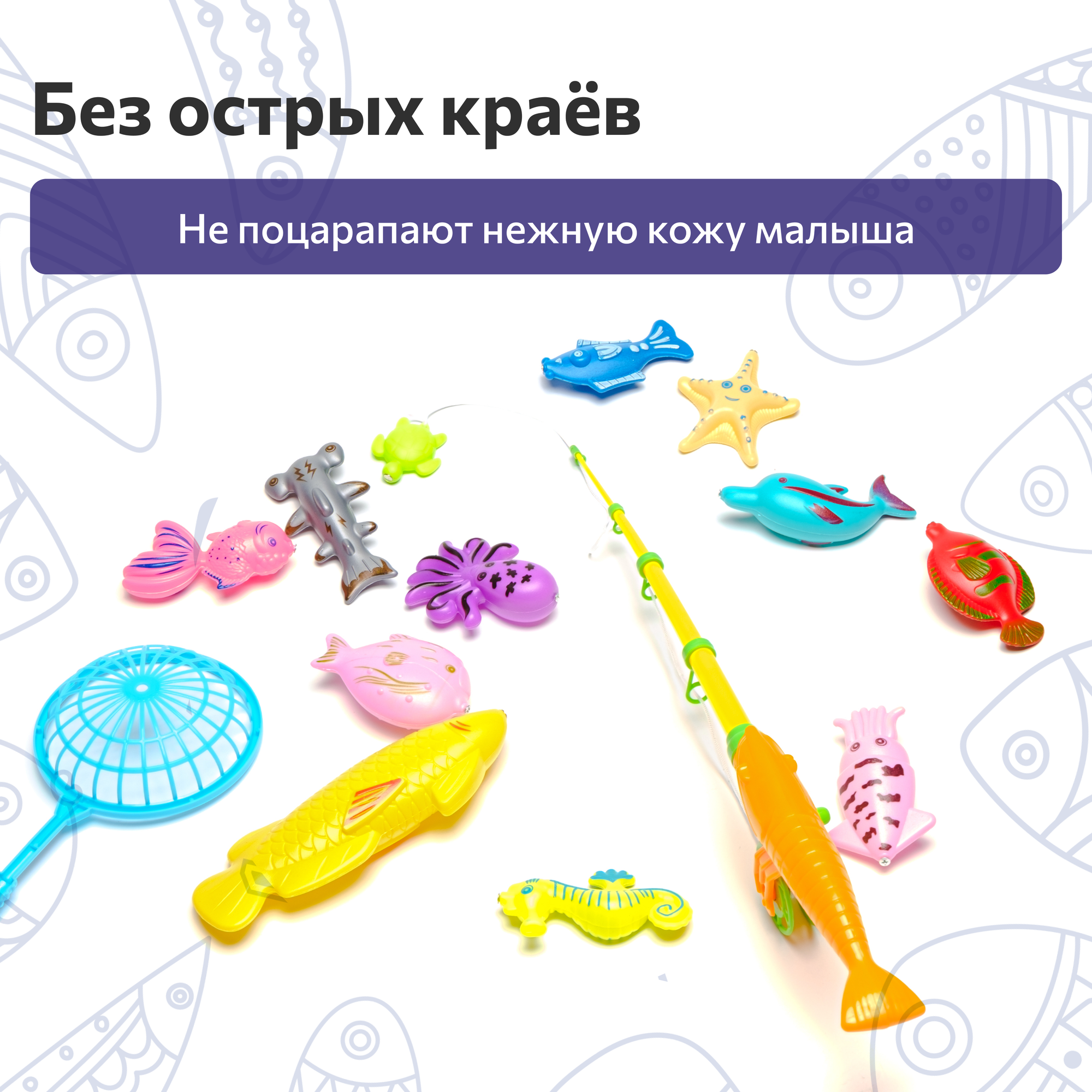 | Виды игрушек в комплекте | рыбка, сачок, сортер, удочка |