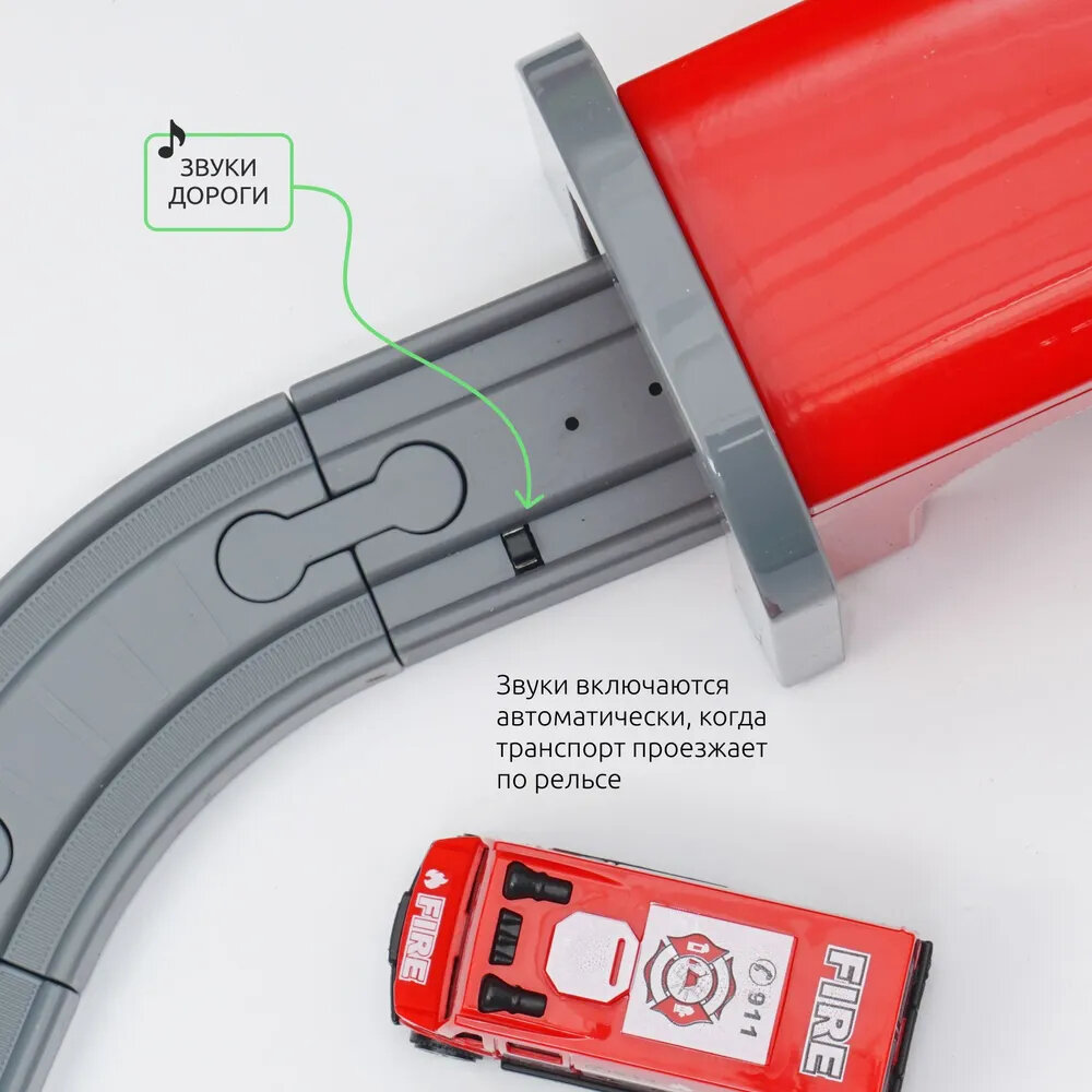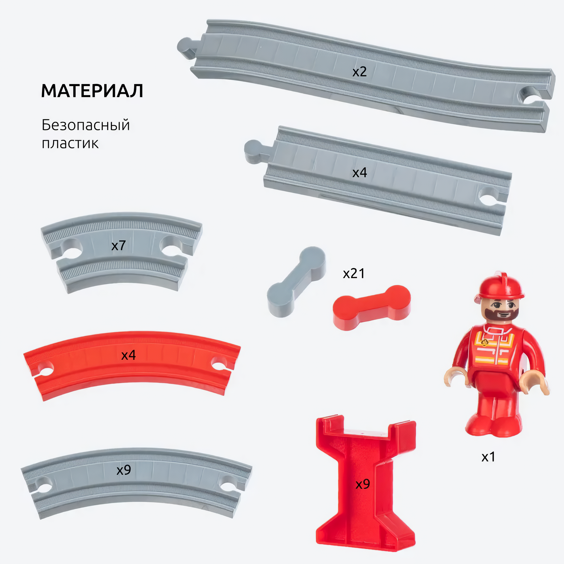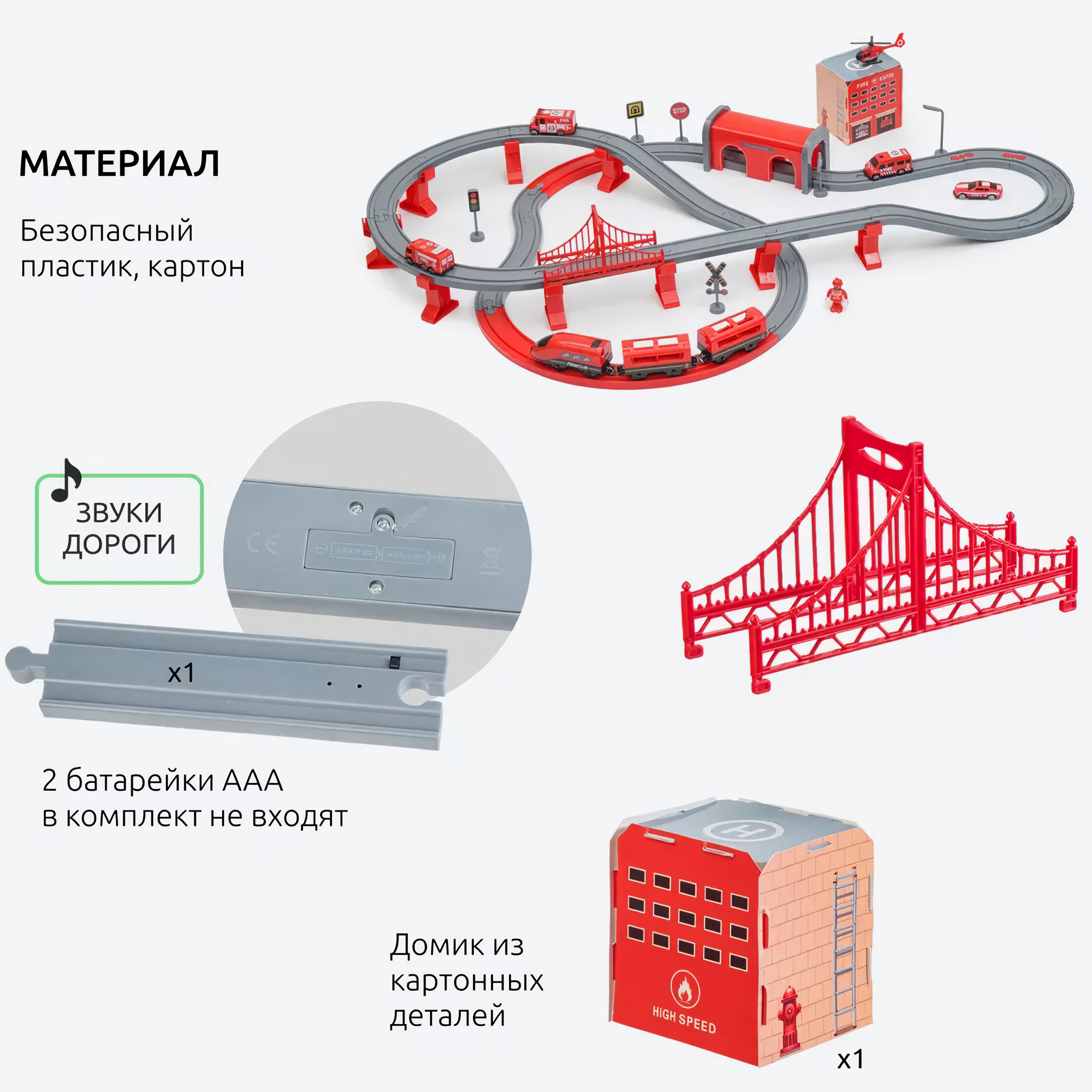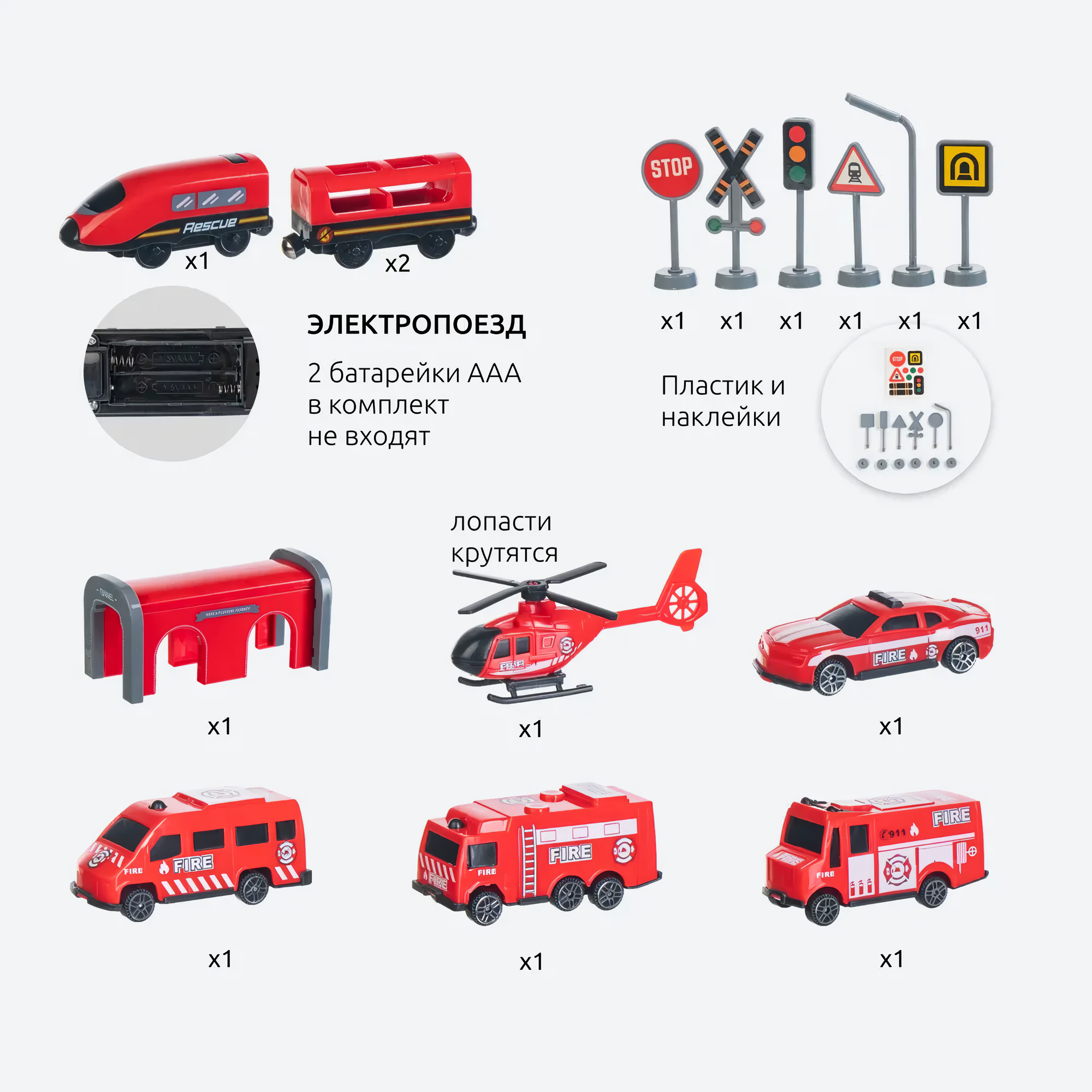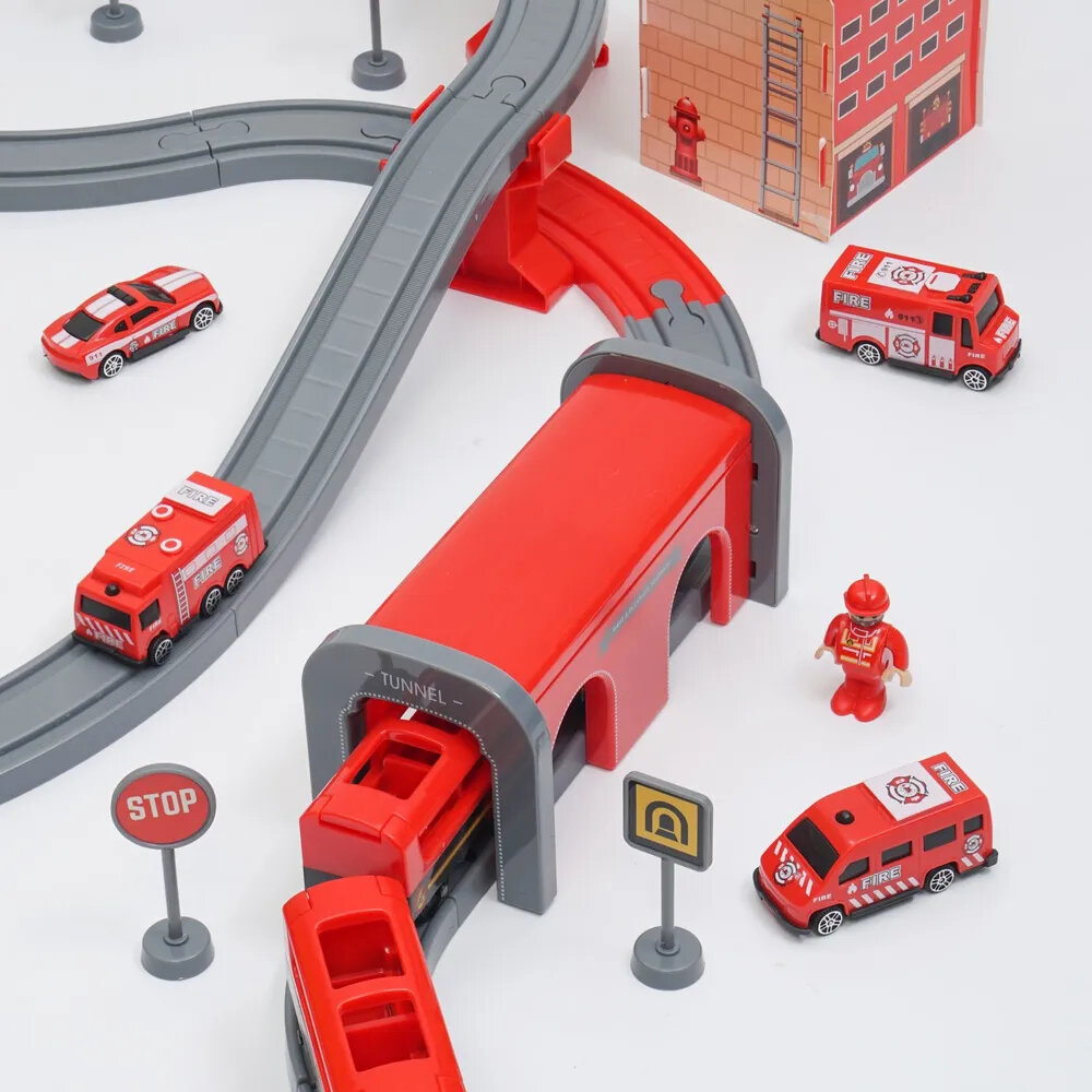 Двухуровневая железная дорога c электропоездом, машинками и аксессуарами Fire Rescue Train Пожарные, 92 детали Красный