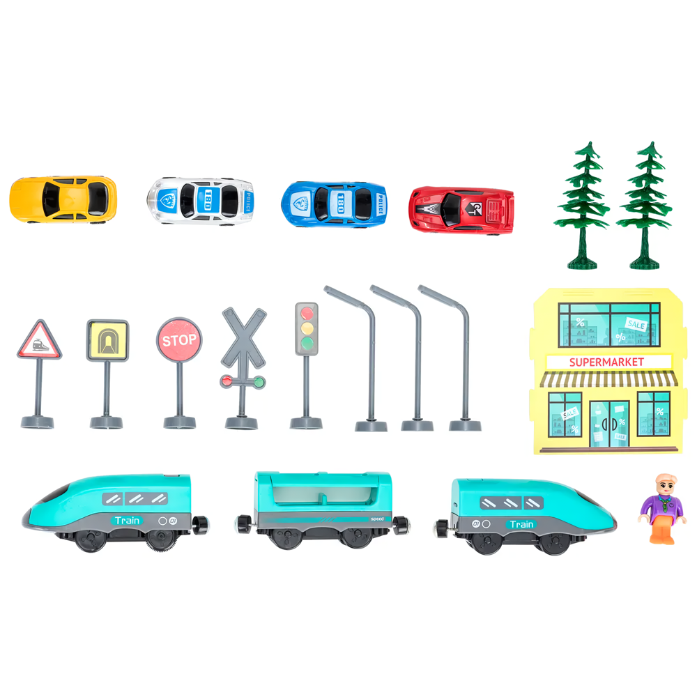 | Комплектация | поезд / вагоны / железнодорожные пути / набор машинок / здание / дорожные знаки |