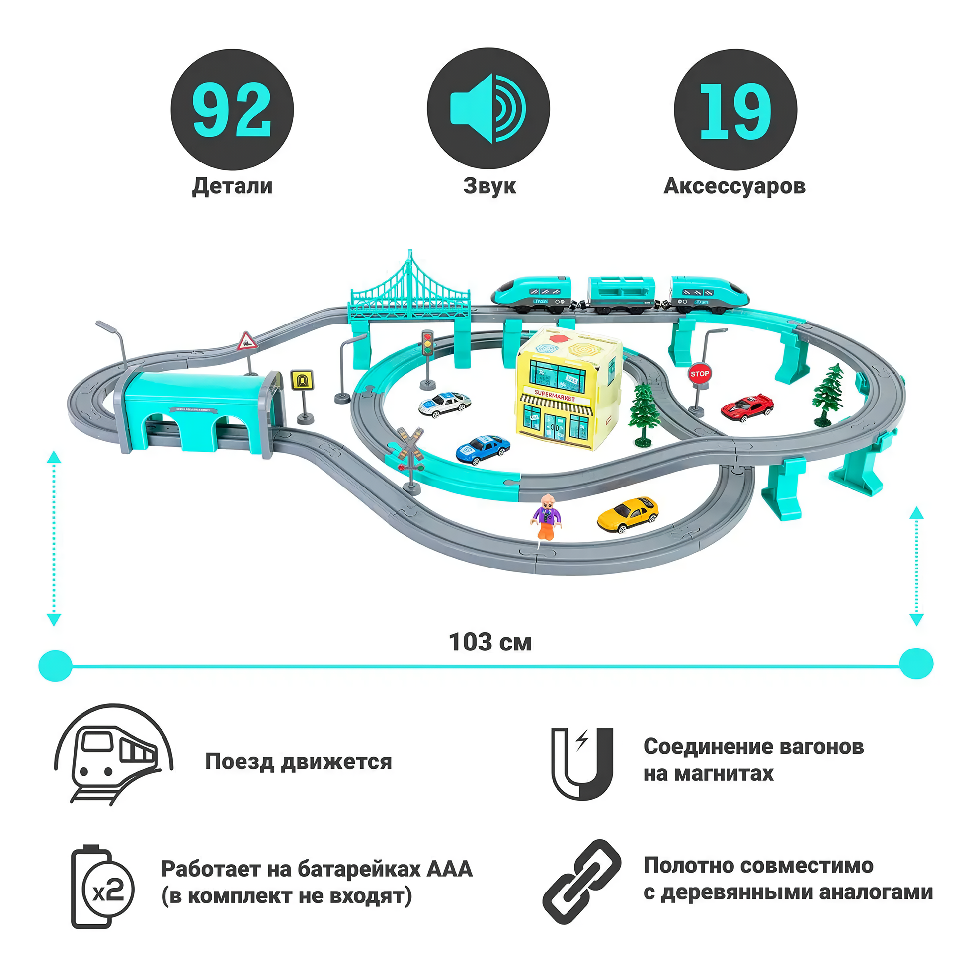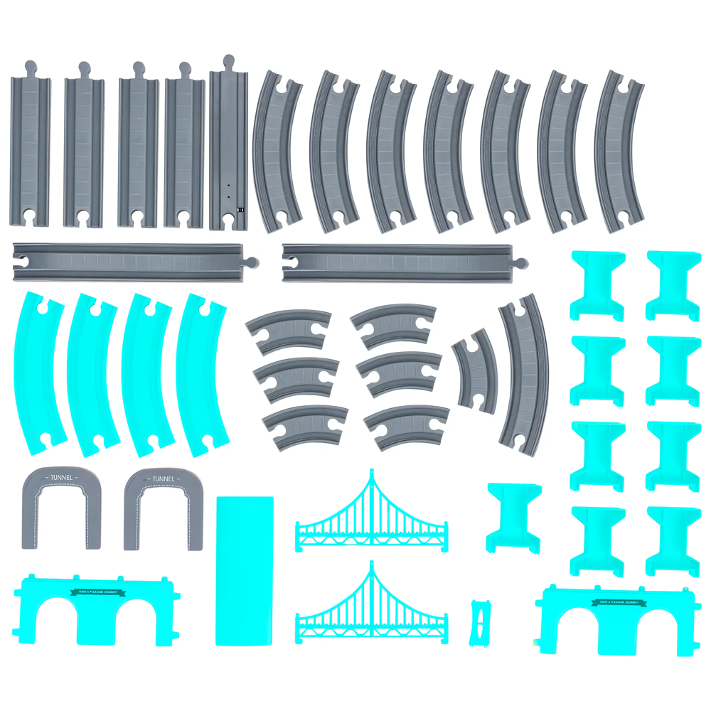 Двухуровневая железная дорога c электропоездом, машинками и аксессуарами City Train Городской поезд, 92 детали Бирюзовый