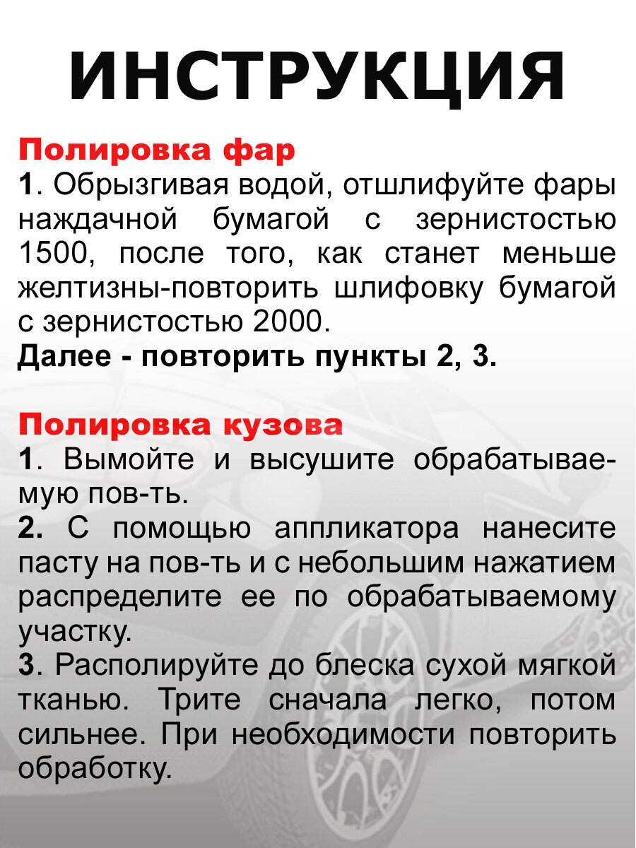 | Способ применения | ПОЛИРОВКА КУЗОВА : 1. Вымойте и высушите обрабатываемую поверхность. 2. С помощью аппликатора нанесите пасту на поверхность и с небольшим нажатием распределите ее по обрабатываемому участку. 3. Располируйте до блеска сухой мягкой тканью. Трите сначала легко, потом сильнее. При необходимости повторить обработку. ПОЛИРОВКА ФАР: 1. Обрызгивая водой, отшлифуйте фары наждачной бумагой с зернистостью 1500, после того, как станет меньше желтизны - повторить шлифовку бумагой с зернистостью 2000. ДАЛЕЕ ПОВТОРИТЬ ПУНКТЫ 2, 3. |
