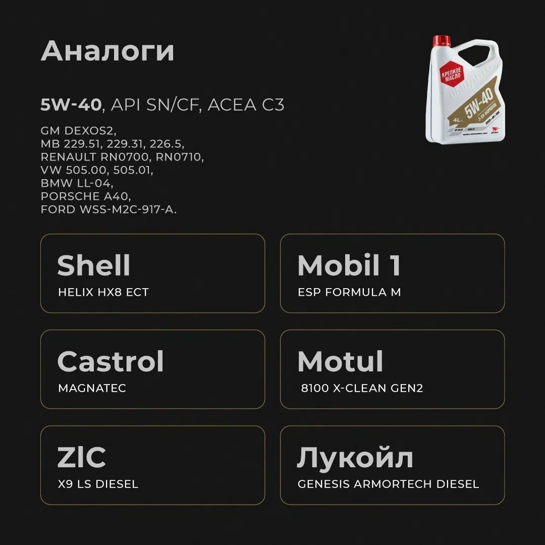 | Дополнительная информация | Соответствует допускам автопроизводителей: • GM DEXOS2 • MB-APPROVAL 229.51 • MB 229.31, 226.5 • RENAULT RN0700, RN0710 • VW 505.00, 505.01 • BMW LL-04 • PORSCHE A40 • FORD WSS-M2C-917-A. |