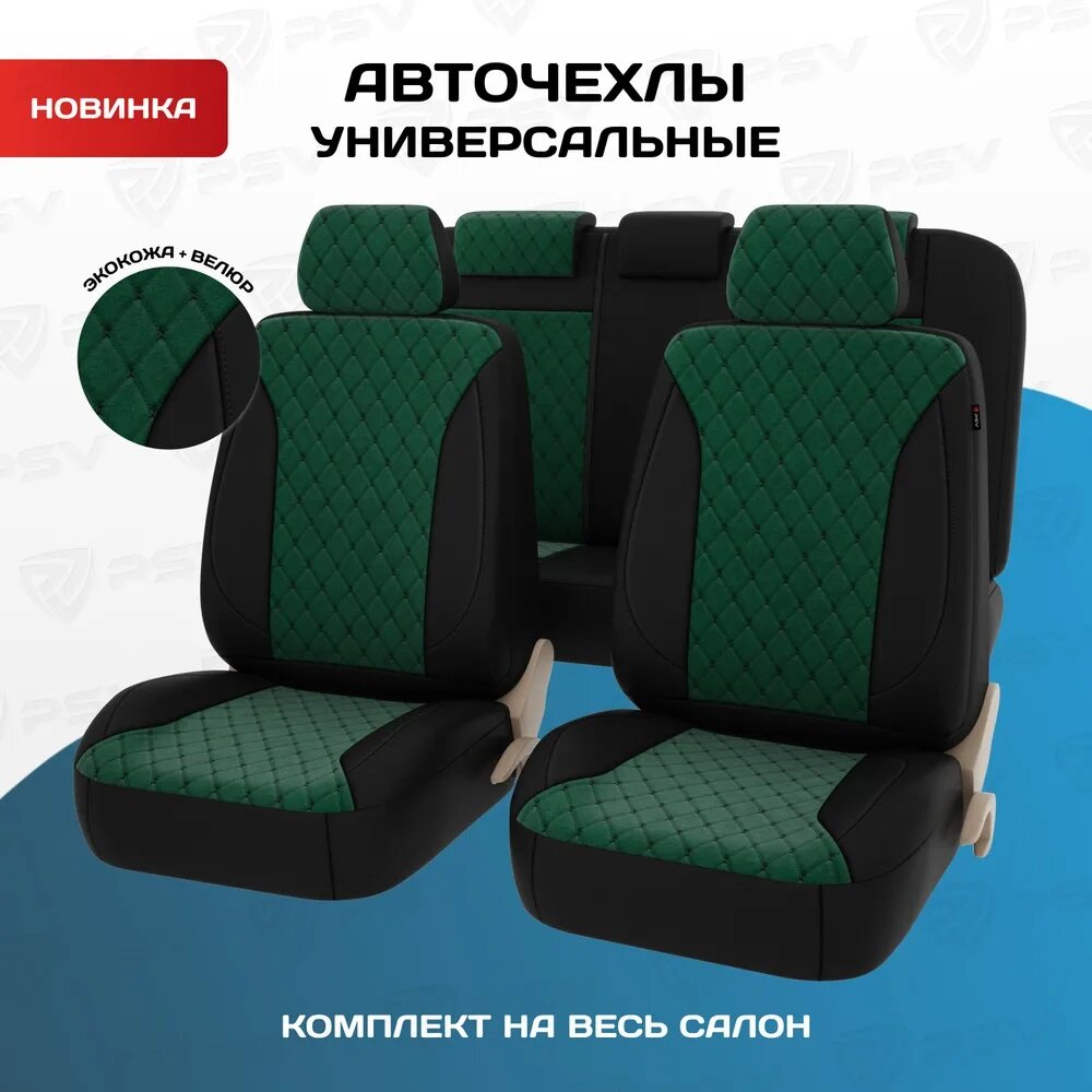 СохранитьЧехлы в машину универсальные PSV Graf Next (Черно-зеленый, ромб черный), велюр + экокожа, 136470 интересное: