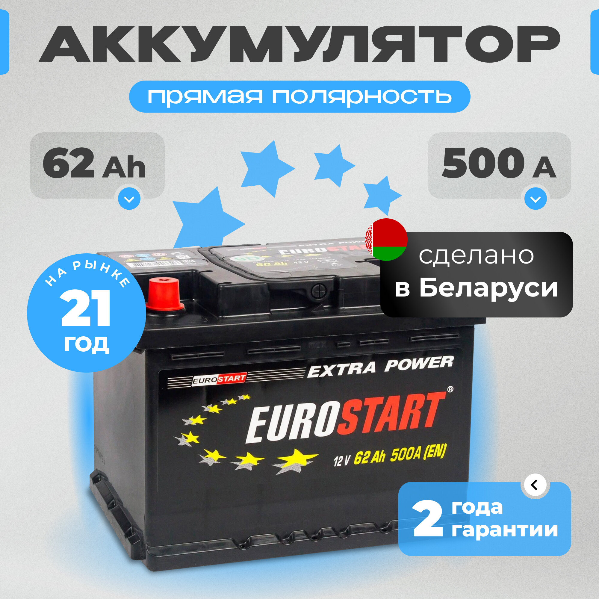 Купить Аккумулятор автомобильный EUROSTART Extra Power (низкий) 62 Ah 500 A прямая полярность 242x175x175