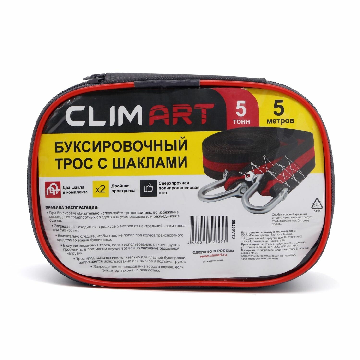 Трос буксировочный с шаклами Clim Art 12т, 5м. в сумке