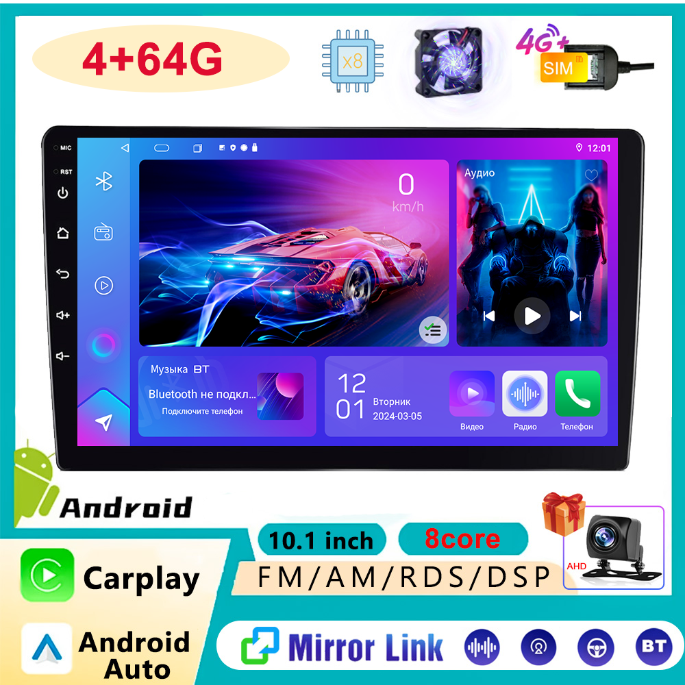 Купить Магнитола 4G 4+64GB Универсальная 10.1 дюймов, 8-ми ядерный процессор, QLED экран, DSP, 4G, WiFi, 2 DIN ,Интеллектуальное Охлаждение/Подарочная камера AHD-720P