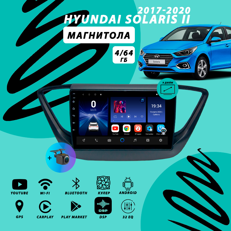 Магнитола Hyundai Solaris 2 (2017-2020) 4Гб+64Гб/Android/Carplay/кулер/Wi-Fi/Bluetooth/2din/штатная магнитола