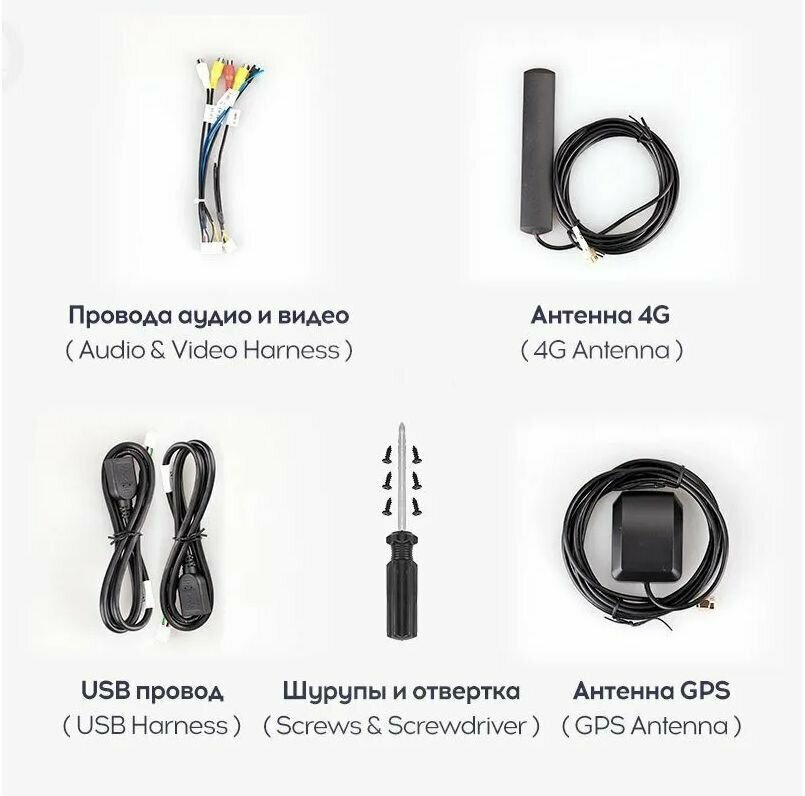 | Подробная комплектация | Магнитола10 дюймов, провода аудио-видео, антенна 4G, антенна GPS, USB провод, шурупы и отвертка, упаковка, схема подключения проводов, электронная инструкция |