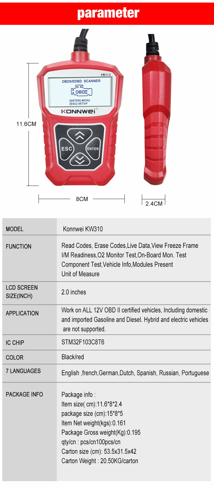 Купить Автомобильный детектор неисправностей KONNWEI KW310, OBD, инструмент диагностики, карта считывания, elm327, obd2