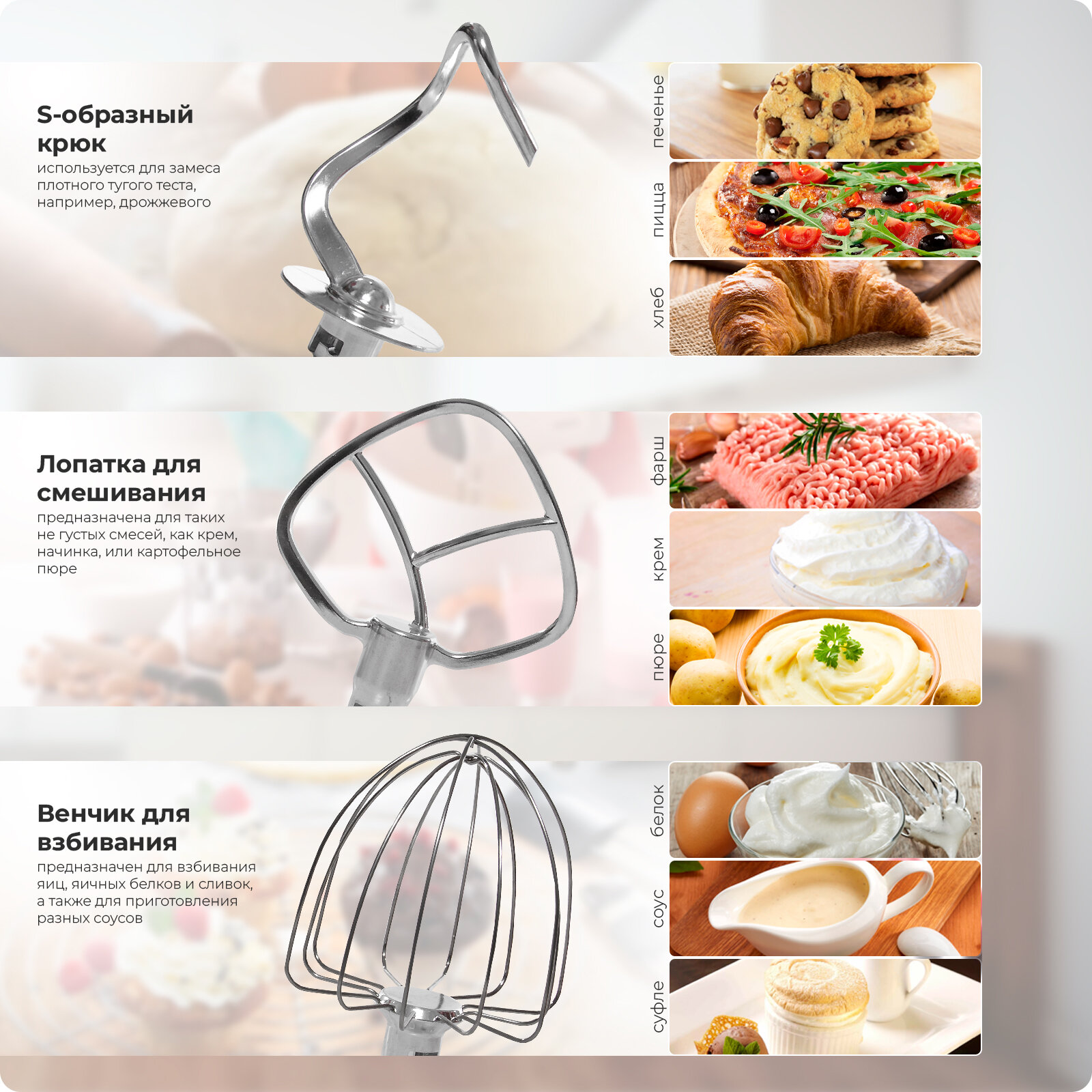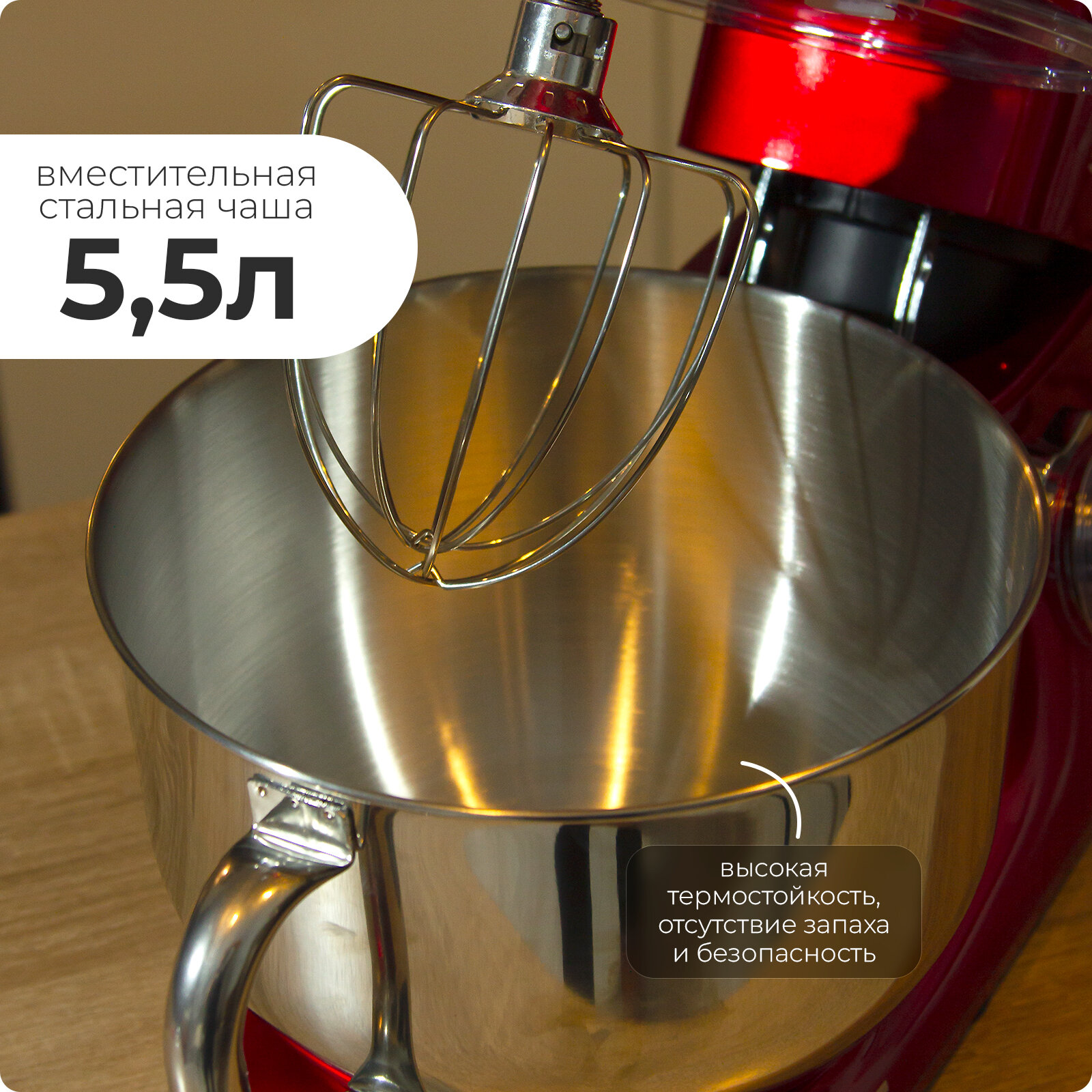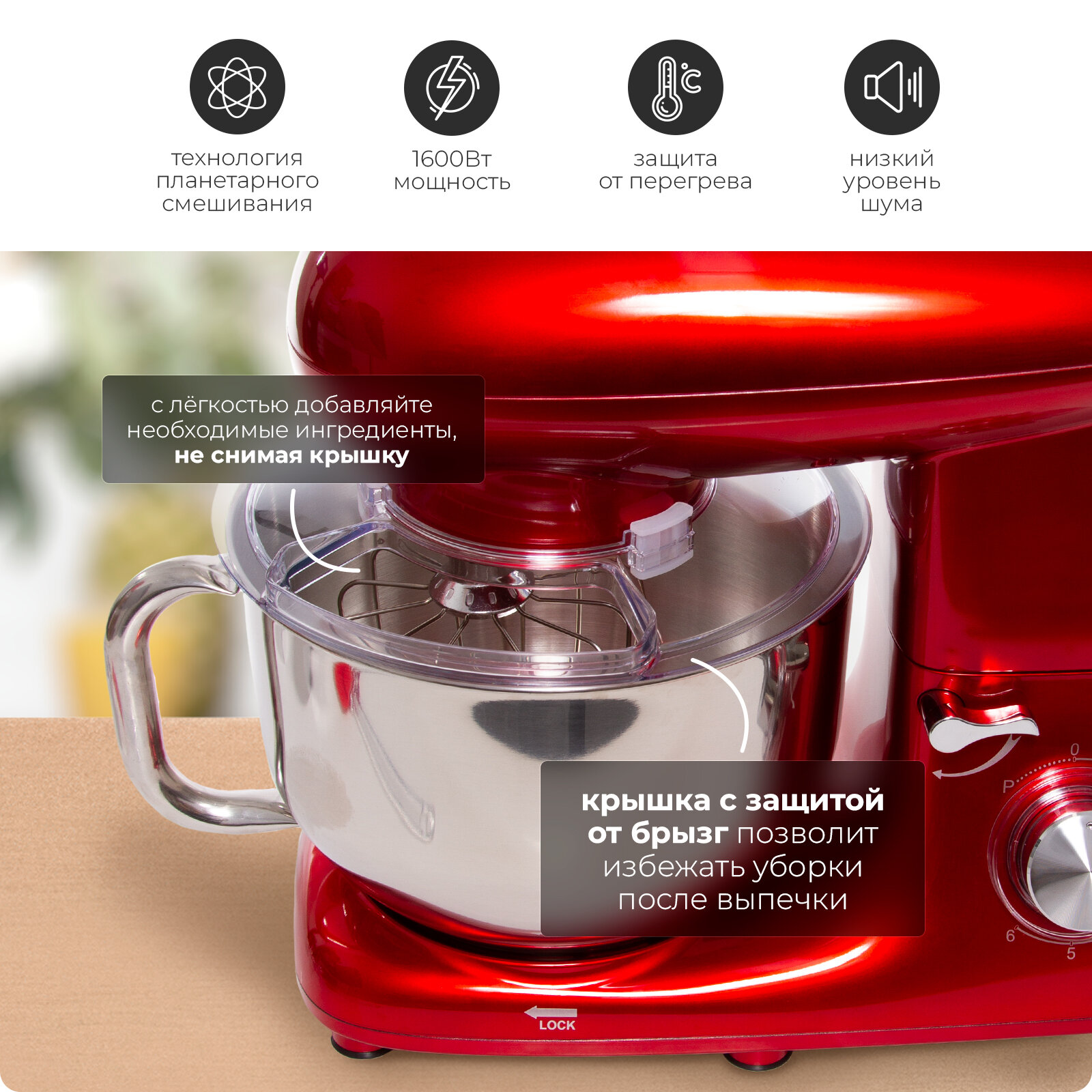 Миксер планетарный Hans&Helma кухонная машина мощность 1600 Вт, 6 скоростей, 3 насадки, металлическая нерж. сталь чаша 5,5 л интересное: