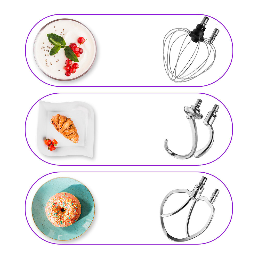 | Насадки | венчик для взбивания / для приготовления фарша / крючки для замешивания теста / насадка для приготовления пюре / насадка-блендер |