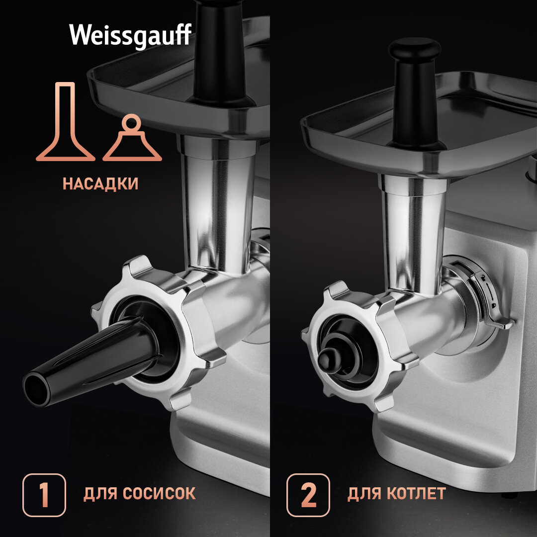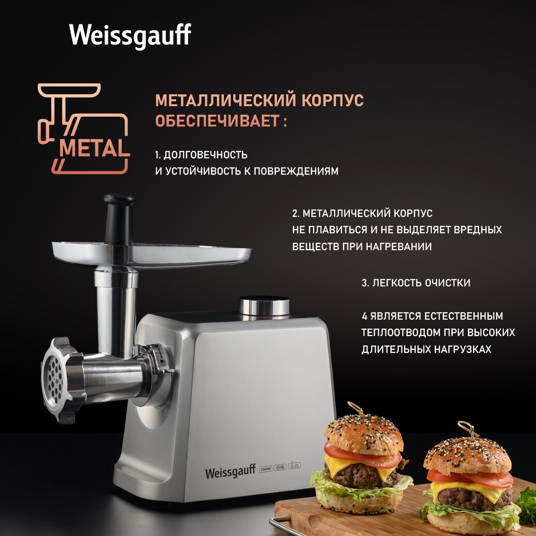 Мясорубка Weissgauff WMG 873 MX digital metal gear, Корпус из Литого алюминия, Дисплей, Металлические шестерни, 2,5 кг в мин , Импульсный режим, Металлический Лоток, 2 года гарантия интересное: