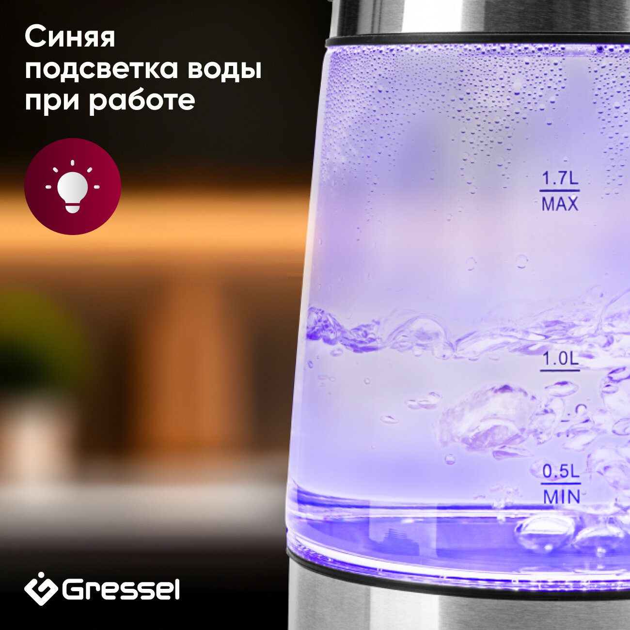 Чайник электрический Gressel GRK-1107 стеклянный с подсветкой, 1,7л, STRIX-контроллер интересное: