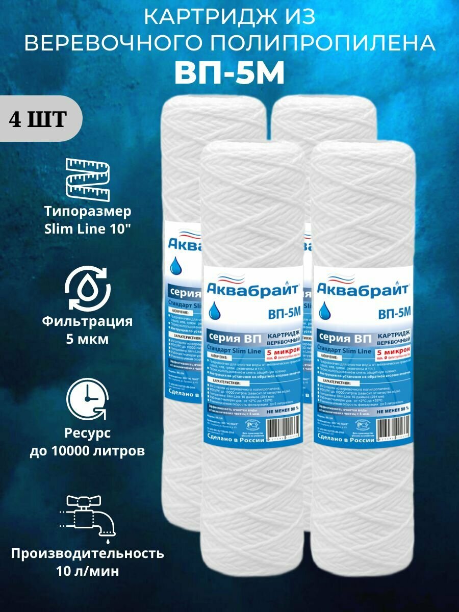 ВП-5М Аквабрайт - 4 шт, веревочный картридж из полипропиленового шнура для механической очистки воды, Slim Line 10 (10sl) интересное: