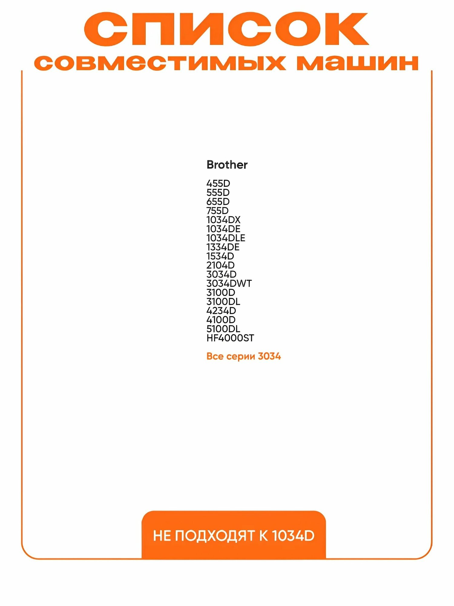 | Совместимость | Brother 755D, 555D, 3034D, 4234D, 4100D, 5100DL, 1534D, 1034DX, 1034DE, 1334DE, 3100D, 3100DL, 455D, 655D, 2104D, 1034DLE, 3034DWT, HF4000ST Все серии 3034 НЕ ПОДХОДЯТ К 1034D |