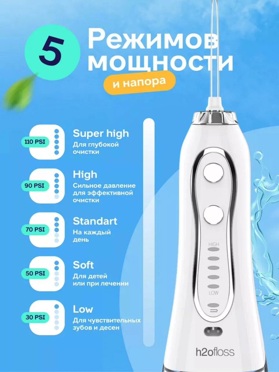 Портативный ирригатор H2Ofloss для очистки полости рта с 5 сменными насадками для чистки зубов и брекетов интересное: