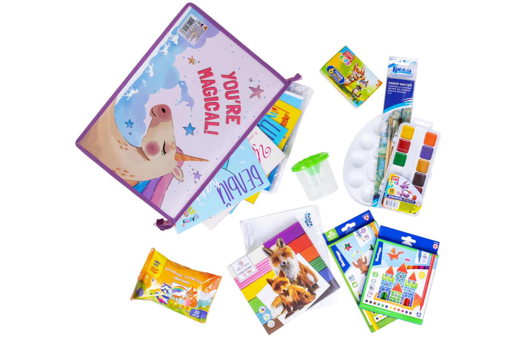| В комплекте | альбом для рисования, доска для лепки, клей-карандаш, краски, ножницы, обложка, пенал, пластилин, ручка, точилка, фломастеры, цветная бумага, цветной картон |