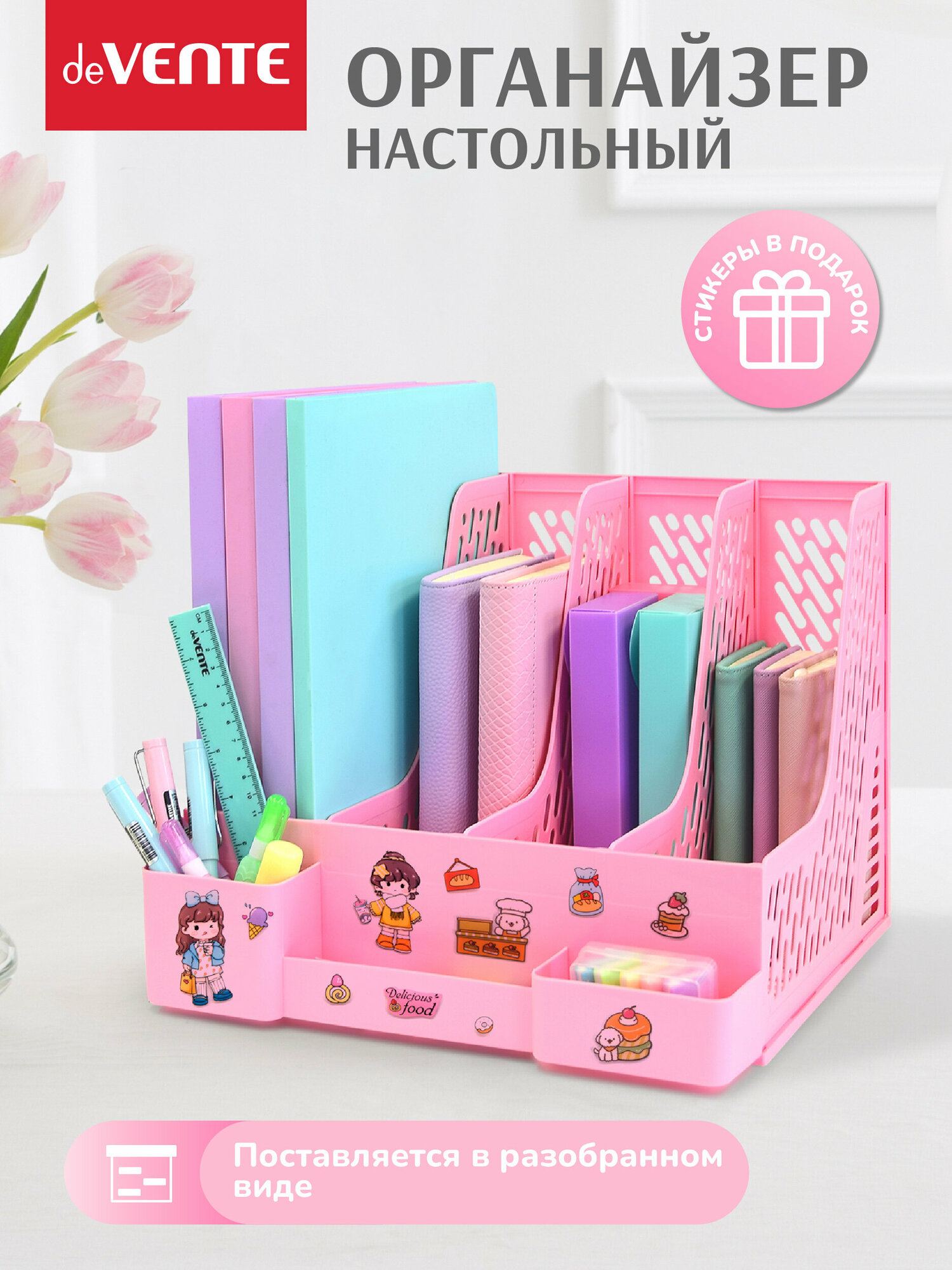 Подставка-органайзер + лоток вертикальный deVENTE Universal 4 секции 3 отделения, сборный зеленый со стикерами kawaii