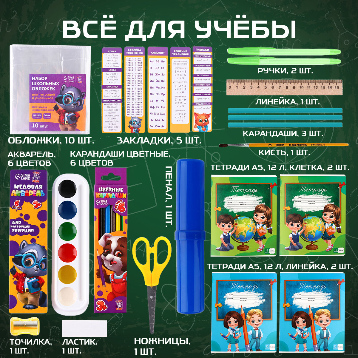 | В комплекте | Набор обложек для тетрадей - 10 шт.; Тетрадь, А5,12 листов, клетка - 2 шт.; Тетрадь, А5,12 листов, линия - 2 шт.; Точилка - 1 шт.; Ластик - 1 шт.; Карандаш - 3 шт.; Линейка, дерево, 15 см - 1 шт.; Кисточка, пони №3 - 1 шт.; Пенал пластиковый - 1 шт.; Акварель медовая, 6 цветов - 1 шт.; Ножницы - 1 шт.; Карандаши цветные, 6 цветов - 1 шт.; Ручка шариковая, синяя паста - 2 шт.; Картонные закладки - 5 шт. |