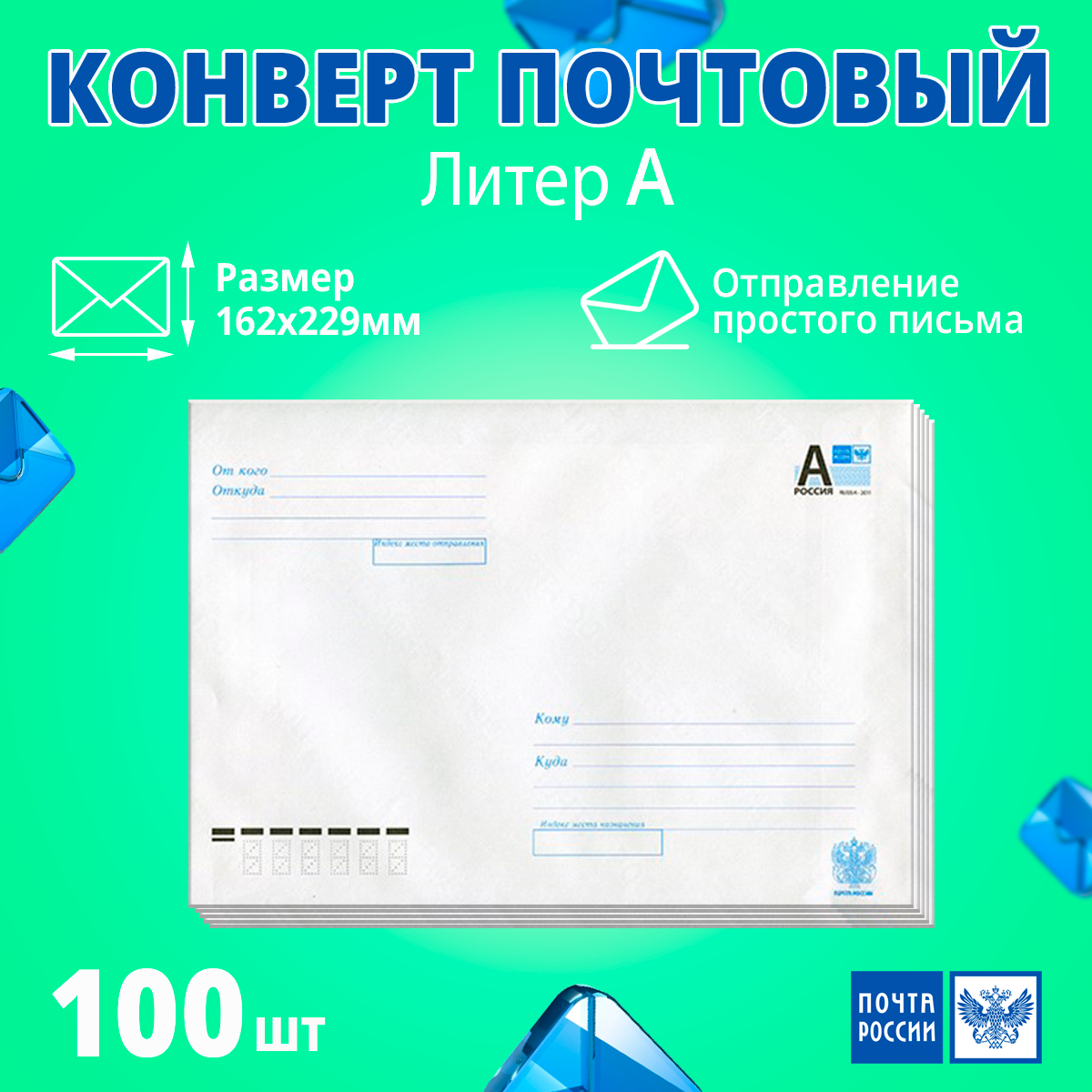 Конверт почтовый маркированный литер А по России, 110x220мм, 100 шт