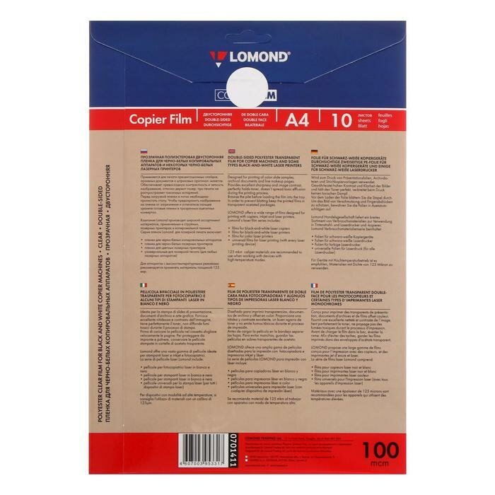 Пленка для черно-белых копировальных аппаратов Lomond А4 прозрачная, двусторонняя (10 листов) 100 мкм (0701411)