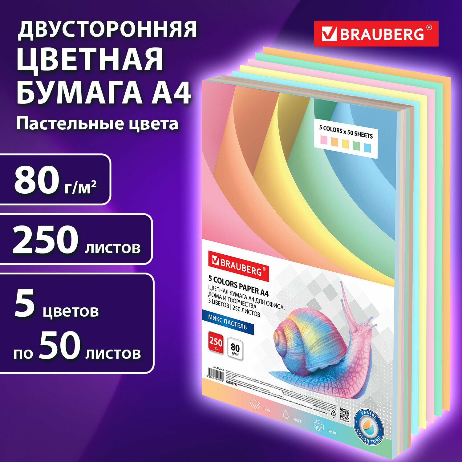 Бумага цветная Brauberg , А4, 80 г/м2, 250 л., (5 цветов х 50 листов), пастель, для офисной техники