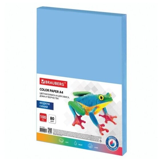 Бумага цветная для принтера офисная Brauberg, А4, 80 г/м2, 100 л, медиум, синяя, для офисной техники, 112459