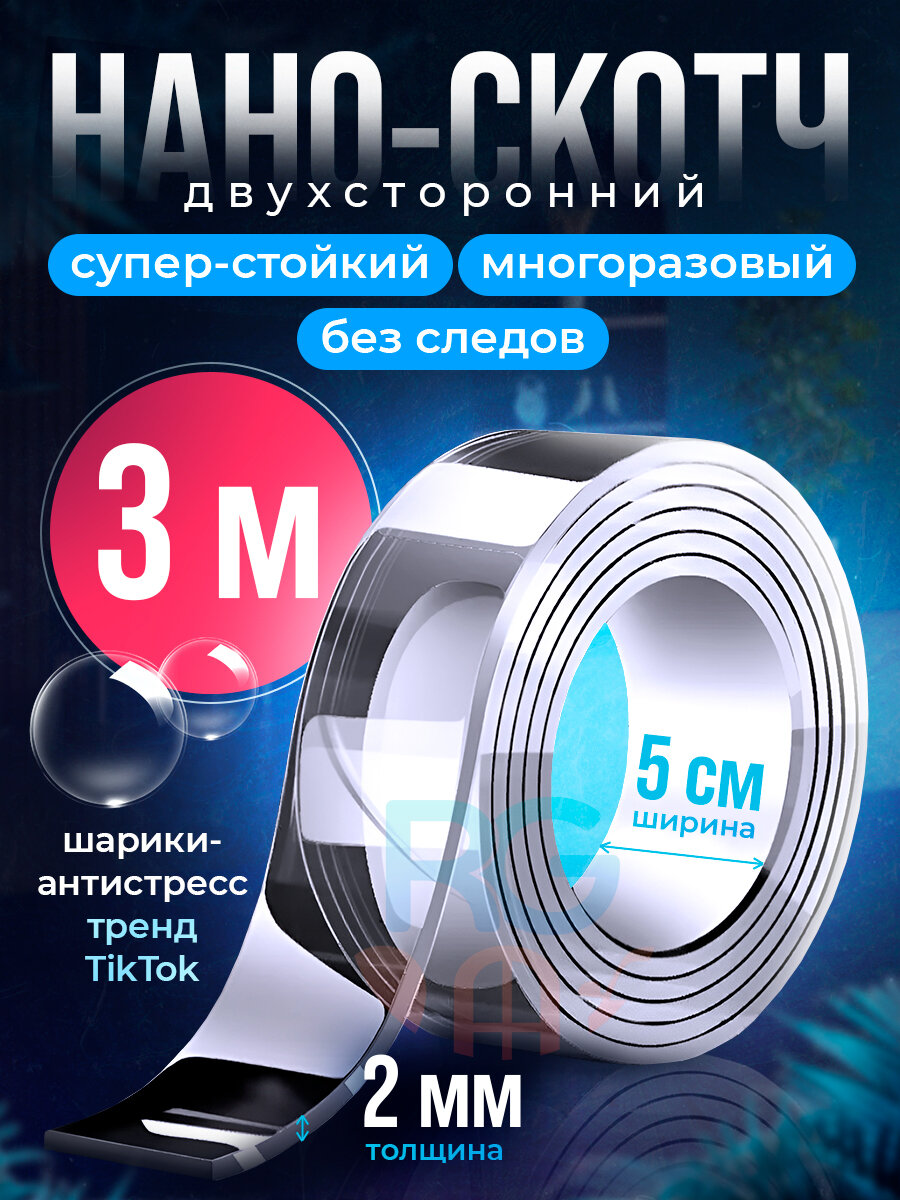 Нано скотч двухсторонний. Нано лента прозрачная 3м * 3 см, комплект 2 шт