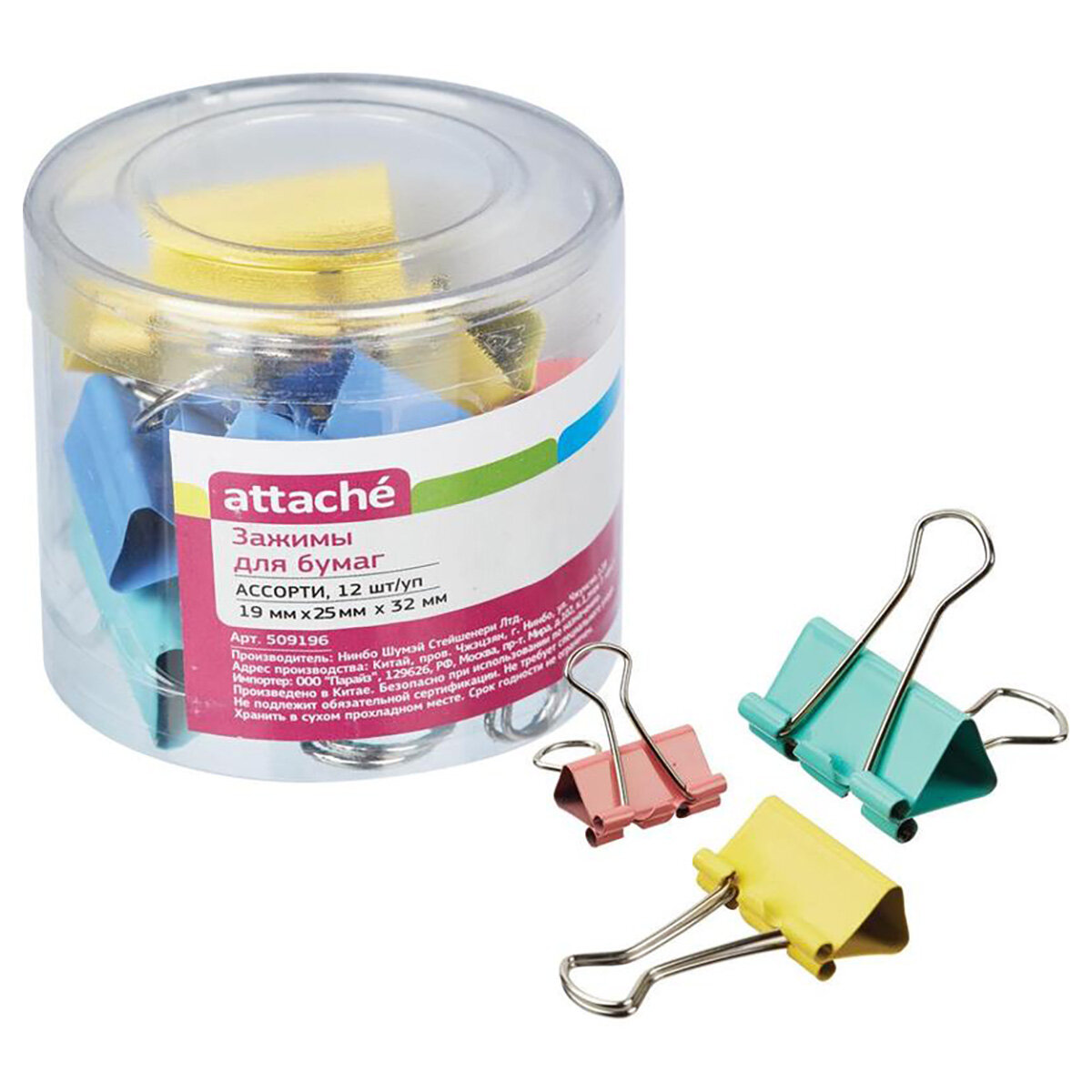 Купить Зажимы для бумаг ассорти цветн (19мм,25мм,32мм), 12шт/уп Attache,пласт.бок