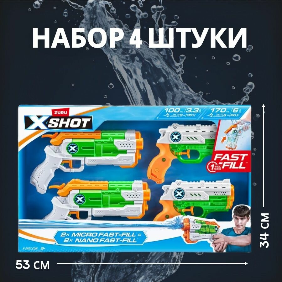 Набор водных бластеров ZURU X-SHOT WATER Fast-Fill Nano Water Blaster / Нано, 4 шт., игрушки для мальчиков, 11857
