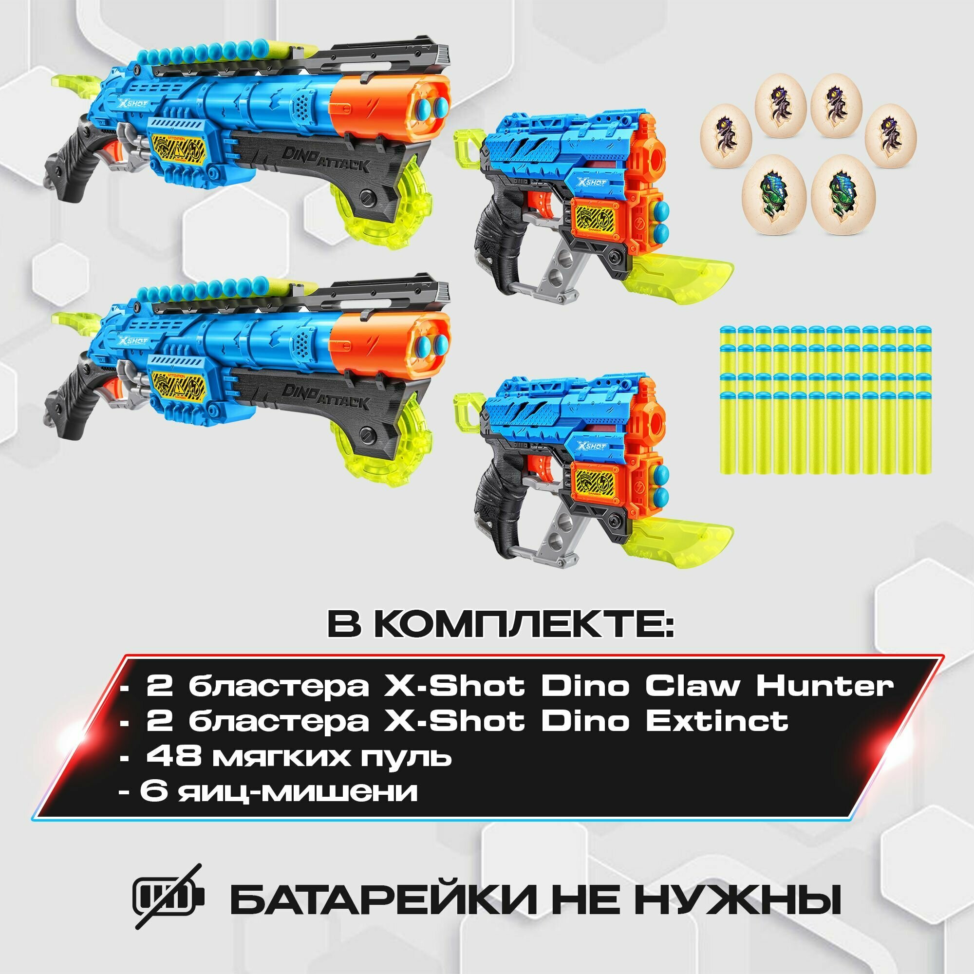 Игрушечный автомат с мягкими пулями и мишенями, 4 бластера Дино в комплекте, оружие, игрушка для мальчика, подходят стрелы нерф, игровой набор, ZURU X-SHOT, 4879