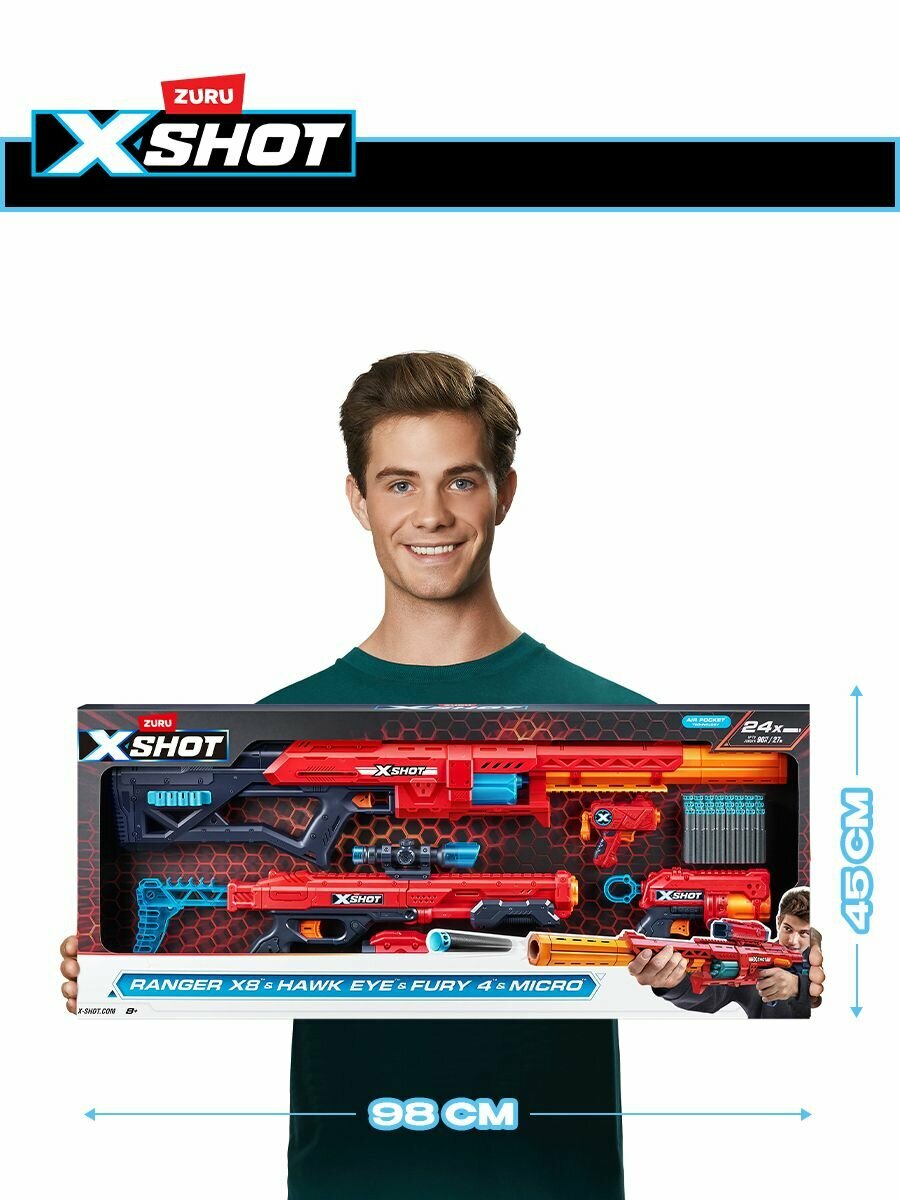 Купить Игровой набор с бластерами 4 шт. пистолет, автомат, ружье ZURU X-SHOT Excel Рендж X8, Соколиный глаз, Фьюри 4, Микро и 24 мягкие пули, 36710 игрушка для мальчика, новинка