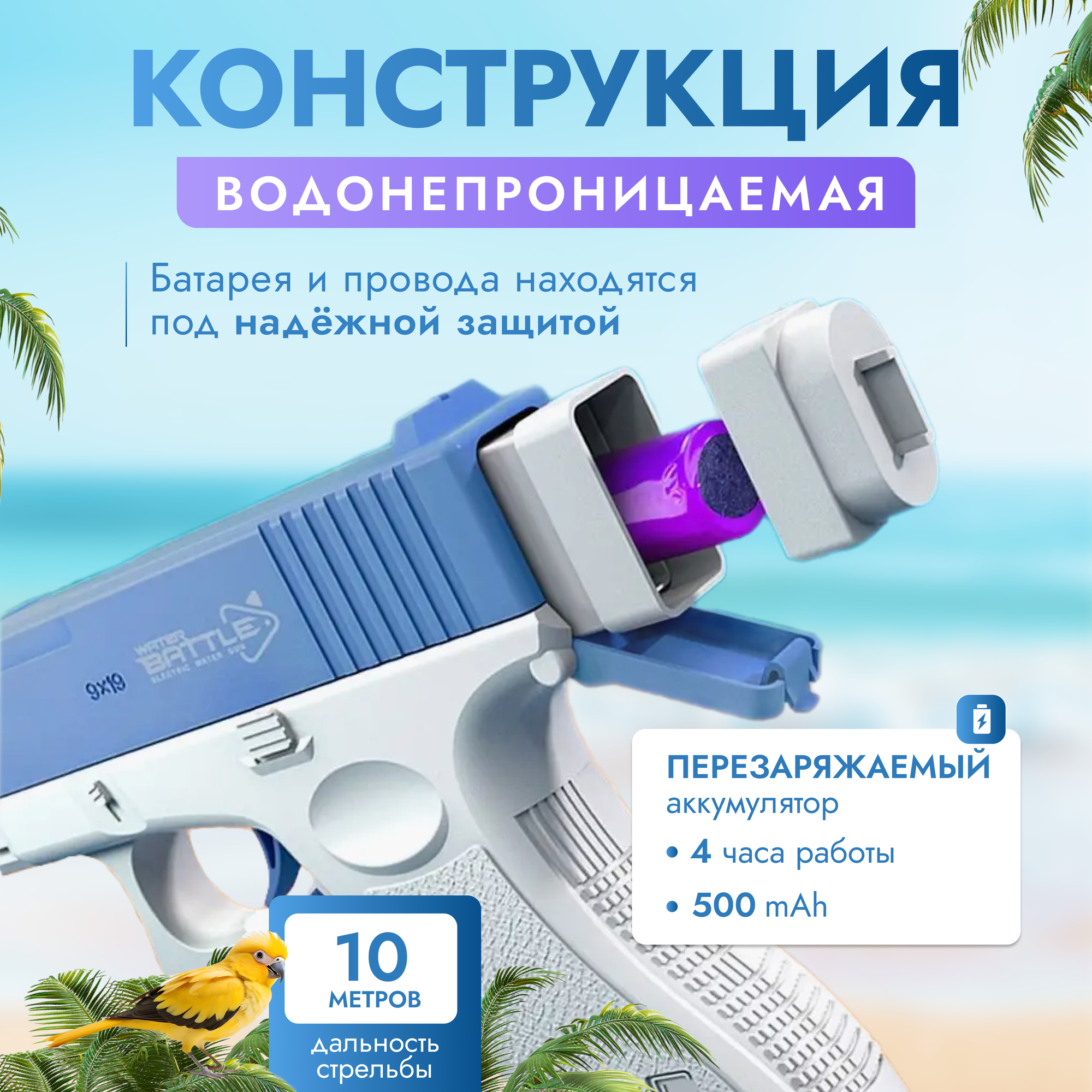 | Комплектация | Водяной пистолет, резервуар 60мл, резервуар 420мл, аккумулятор с кабелем USB |