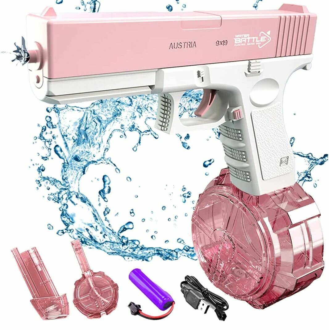 СохранитьВодный электрический пистолет GLOCK глок на аккумуляторе\Мощная новинка 3 поколения, автоматическая стрельба\2 магазина, обоймы в комплекте\Розовый интересное: